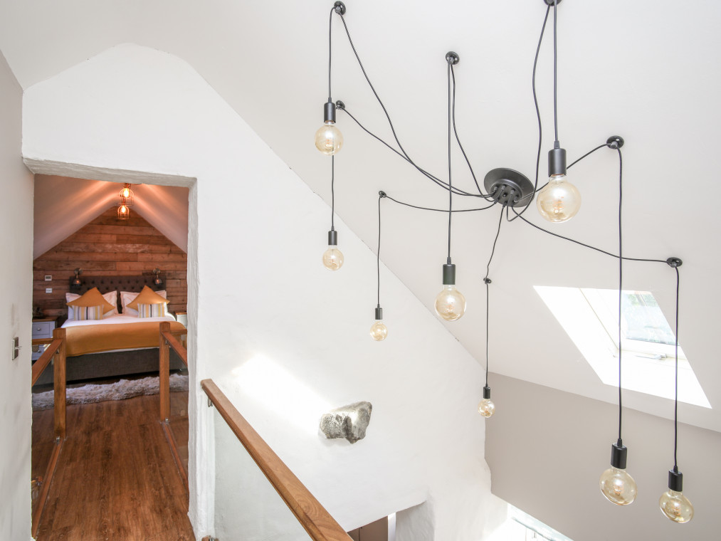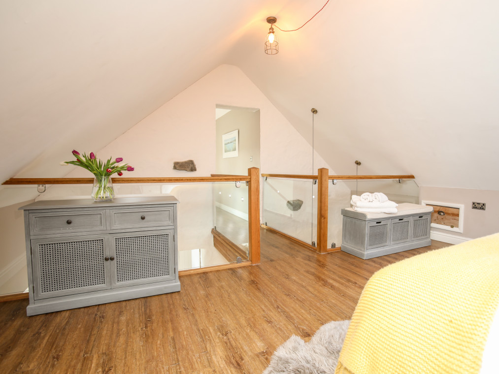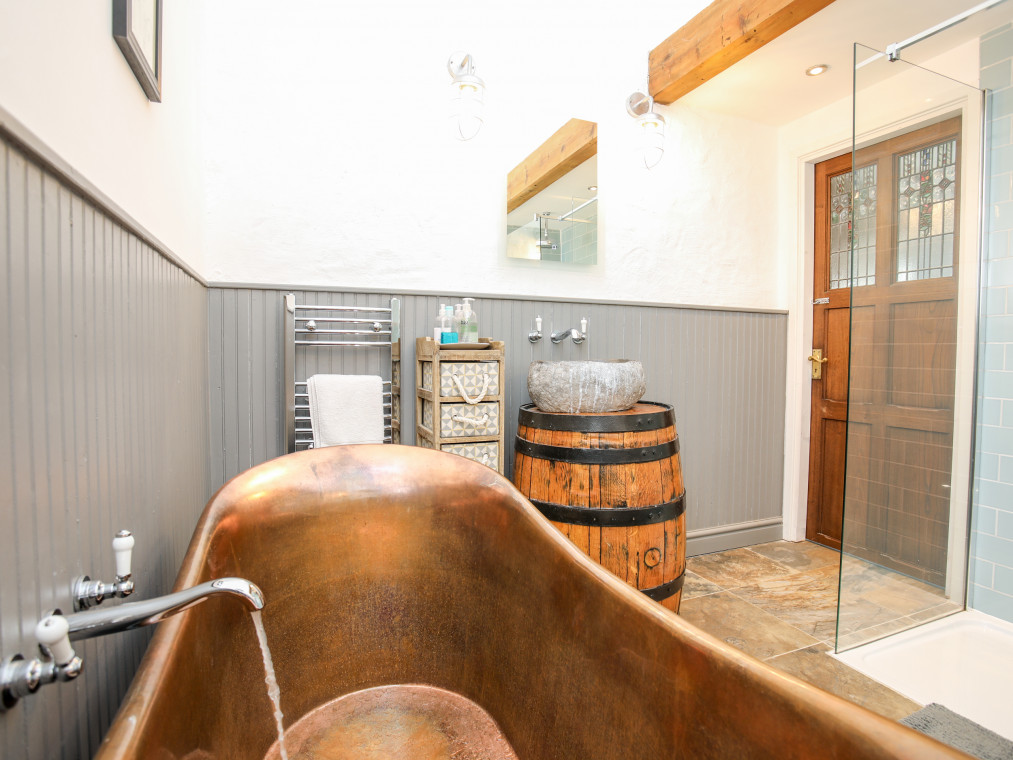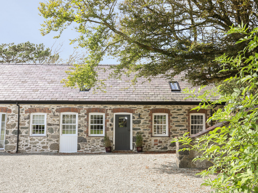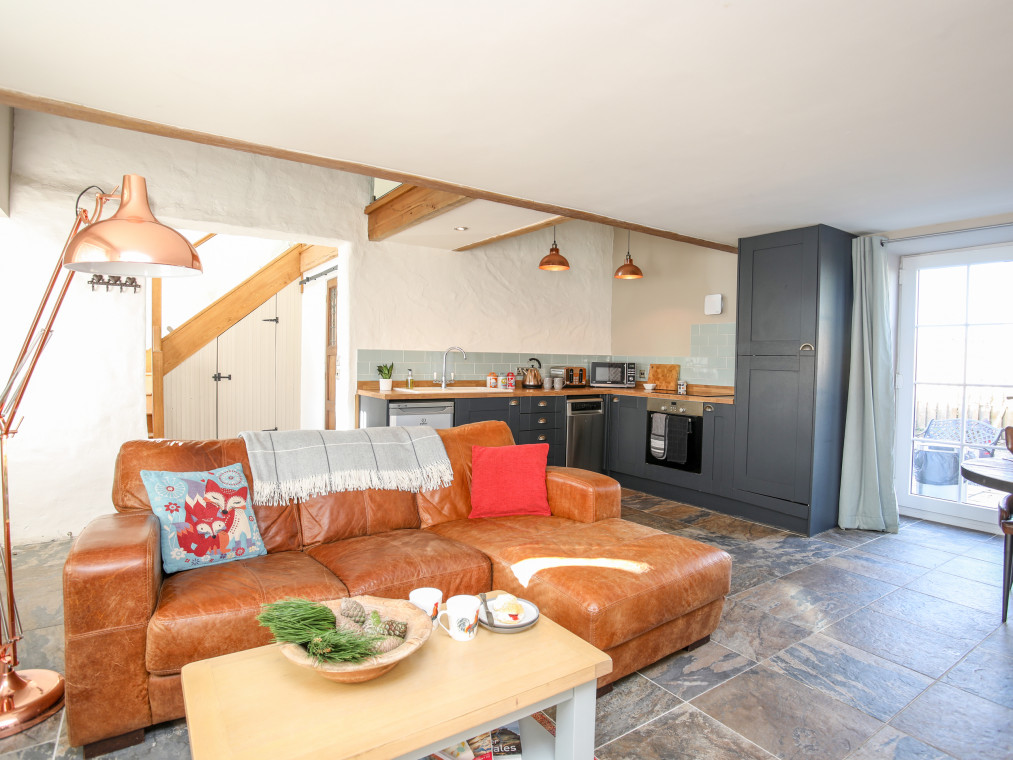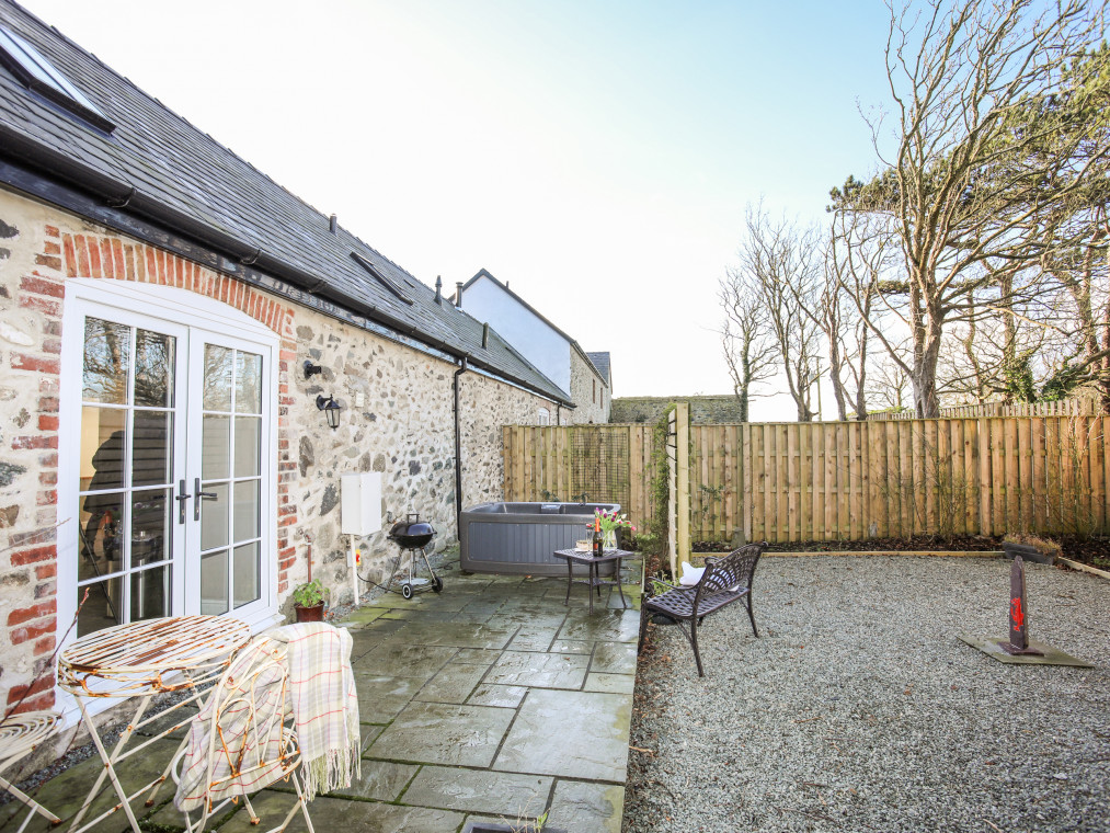 Rhosneigr 4 miles. Offering a pretty retreat in the heart of the Isle of Anglesey is this charming cottage, The Hayloft, a wonderfully converted hay barn now providing stunning holiday accommodation. Perfectly suited to a couple looking for a romantic break, this cottage lies in Bryngwran and is part of the Rhosneigr Country Plas, a beautiful estate built by the Sheriff of Anglesey in 1886. Step inside the open-plan living space and be amazed by the contemporary interior within this vintage property, where a leather L-shaped sofa sits atop the slate flooring, opposite the woodburning stove and the TV, creating a wonderful, relaxing set up to return to after a busy day. Beneath exposed beams and feature copper lighting lies the sleek kitchen, with dark blue units housing a fabulous range of appliances for cooking up a romantic meal for two, to be served at the dining table which sits by the lovely French doors overlooking the patio. Enjoy sitting out here in your own private space and dining alfresco on a summer’s eve, afterwards taking a dip in the bubbling hot tub beneath the stars. A beautiful and unique feature of this property lies within the bathroom, set aside an hour and soak in the amazing free-standing copper bath, with a quirky feature made of the basin set atop a barrel, and a beautiful, large walk-in shower here too. Travel up the wooden stairs to the mezzanine level bedroom, settle under the covers of the double bed beneath the clopping ceilings and rest for the night amidst this thoughtfully decorated space. Head south to the coast at Rhosneigr and pick up any amenities you need from the local shops, dine in one of the restaurants with a sea view, or simply walk along the coast for some spectacular scenery. Some of the best surfing beaches can be found here including Town and Broad Beach, so you can practice your skills on the waves, with surfboards available to hire locally too. As well as being within easy reach of the express way to access many more beautiful locations, The Hayloft is a fantastic romantic retreat. One double bedroom. Bathroom with free-standing copper bath, walk-in shower, basin and WC. Open-plan living space with kitchen, dining area and sitting area Amenities for Rental heating with woodburning stove Electric oven, induction hob, dishwasher, fridge, Smart TV Fuel and power inc. in rent Bed linen and towels inc. in rent Off-road parking Enclosed garden with hot tub and seating Dog-friendly Sorry, no smoking Shop within 2.7 miles, pub within 1 mile
