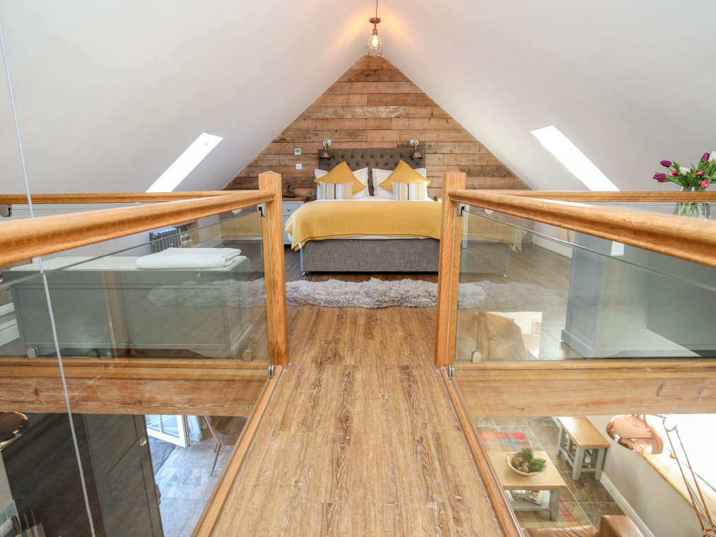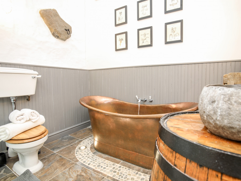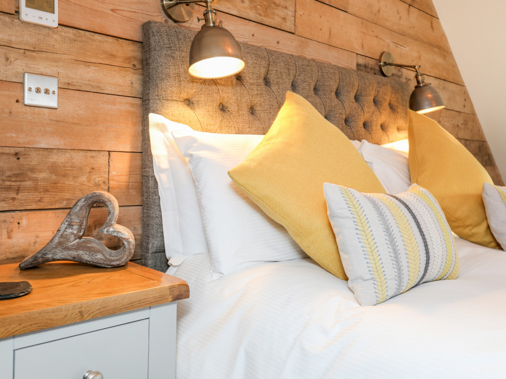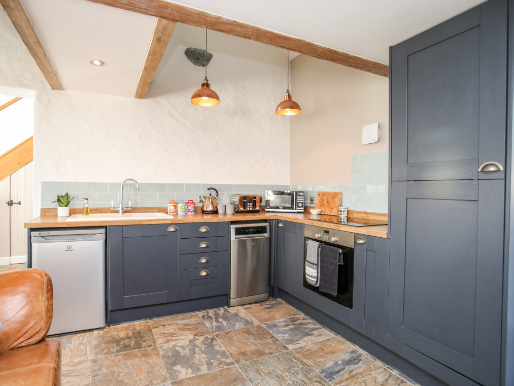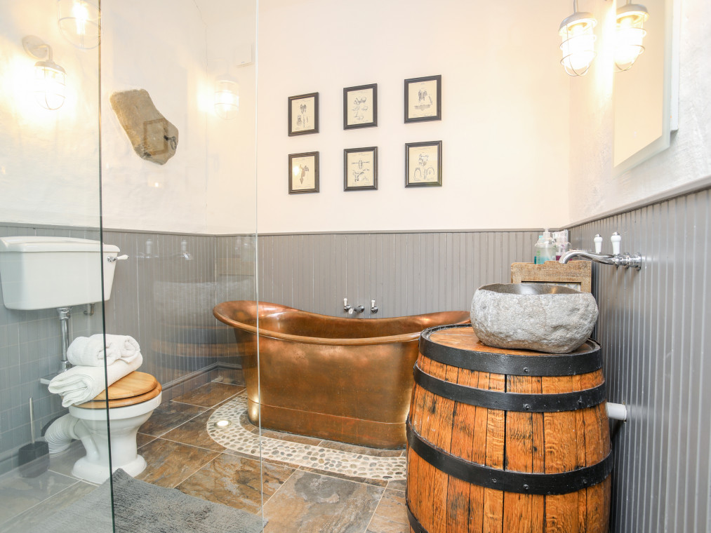 Rhosneigr 4 miles. Offering a pretty retreat in the heart of the Isle of Anglesey is this charming cottage, The Hayloft, a wonderfully converted hay barn now providing stunning holiday accommodation. Perfectly suited to a couple looking for a romantic break, this cottage lies in Bryngwran and is part of the Rhosneigr Country Plas, a beautiful estate built by the Sheriff of Anglesey in 1886. Step inside the open-plan living space and be amazed by the contemporary interior within this vintage property, where a leather L-shaped sofa sits atop the slate flooring, opposite the woodburning stove and the TV, creating a wonderful, relaxing set up to return to after a busy day. Beneath exposed beams and feature copper lighting lies the sleek kitchen, with dark blue units housing a fabulous range of appliances for cooking up a romantic meal for two, to be served at the dining table which sits by the lovely French doors overlooking the patio. Enjoy sitting out here in your own private space and dining alfresco on a summer’s eve, afterwards taking a dip in the bubbling hot tub beneath the stars. A beautiful and unique feature of this property lies within the bathroom, set aside an hour and soak in the amazing free-standing copper bath, with a quirky feature made of the basin set atop a barrel, and a beautiful, large walk-in shower here too. Travel up the wooden stairs to the mezzanine level bedroom, settle under the covers of the double bed beneath the clopping ceilings and rest for the night amidst this thoughtfully decorated space. Head south to the coast at Rhosneigr and pick up any amenities you need from the local shops, dine in one of the restaurants with a sea view, or simply walk along the coast for some spectacular scenery. Some of the best surfing beaches can be found here including Town and Broad Beach, so you can practice your skills on the waves, with surfboards available to hire locally too. As well as being within easy reach of the express way to access many more beautiful locations, The Hayloft is a fantastic romantic retreat. One double bedroom. Bathroom with free-standing copper bath, walk-in shower, basin and WC. Open-plan living space with kitchen, dining area and sitting area Amenities for Rental heating with woodburning stove Electric oven, induction hob, dishwasher, fridge, Smart TV Fuel and power inc. in rent Bed linen and towels inc. in rent Off-road parking Enclosed garden with hot tub and seating Dog-friendly Sorry, no smoking Shop within 2.7 miles, pub within 1 mile