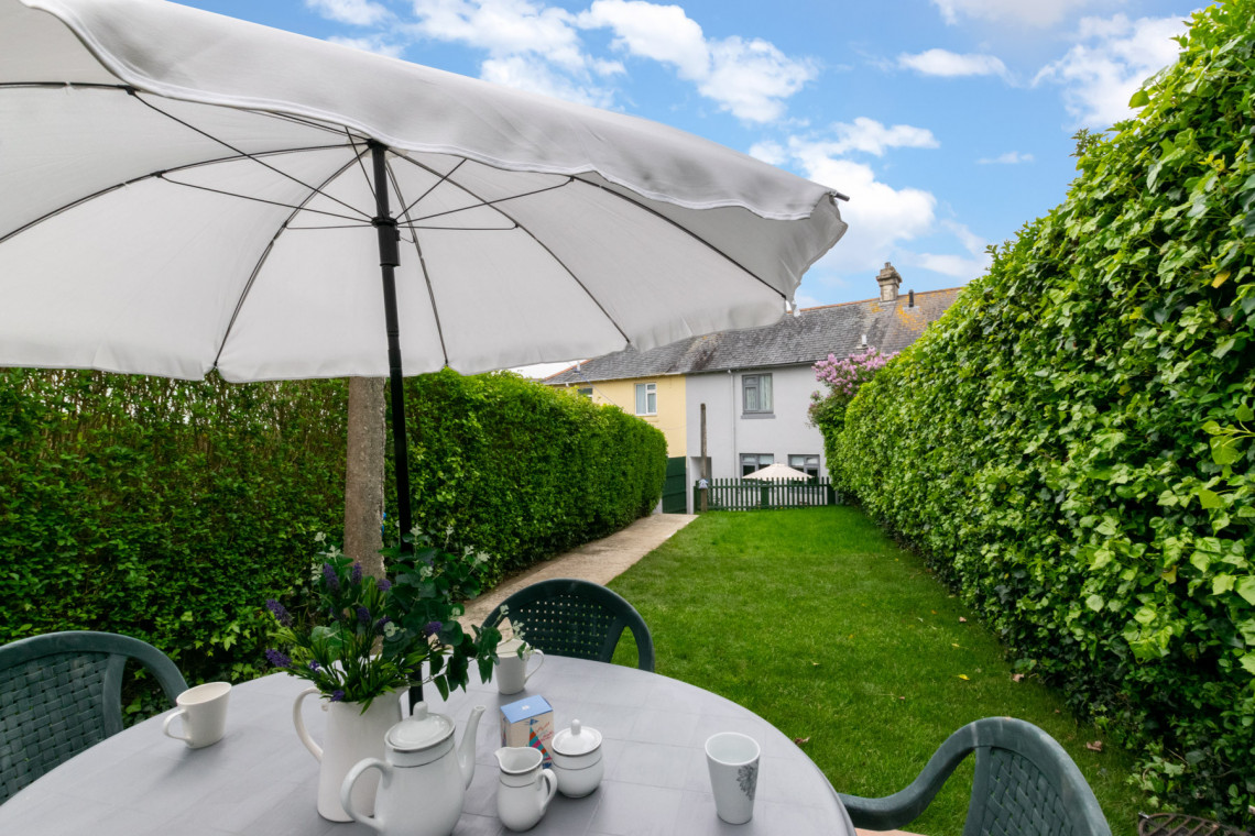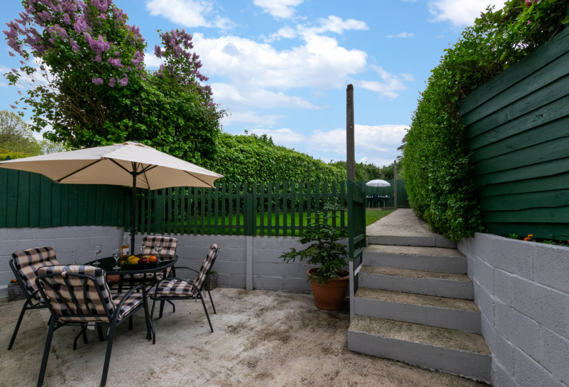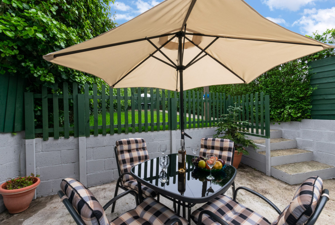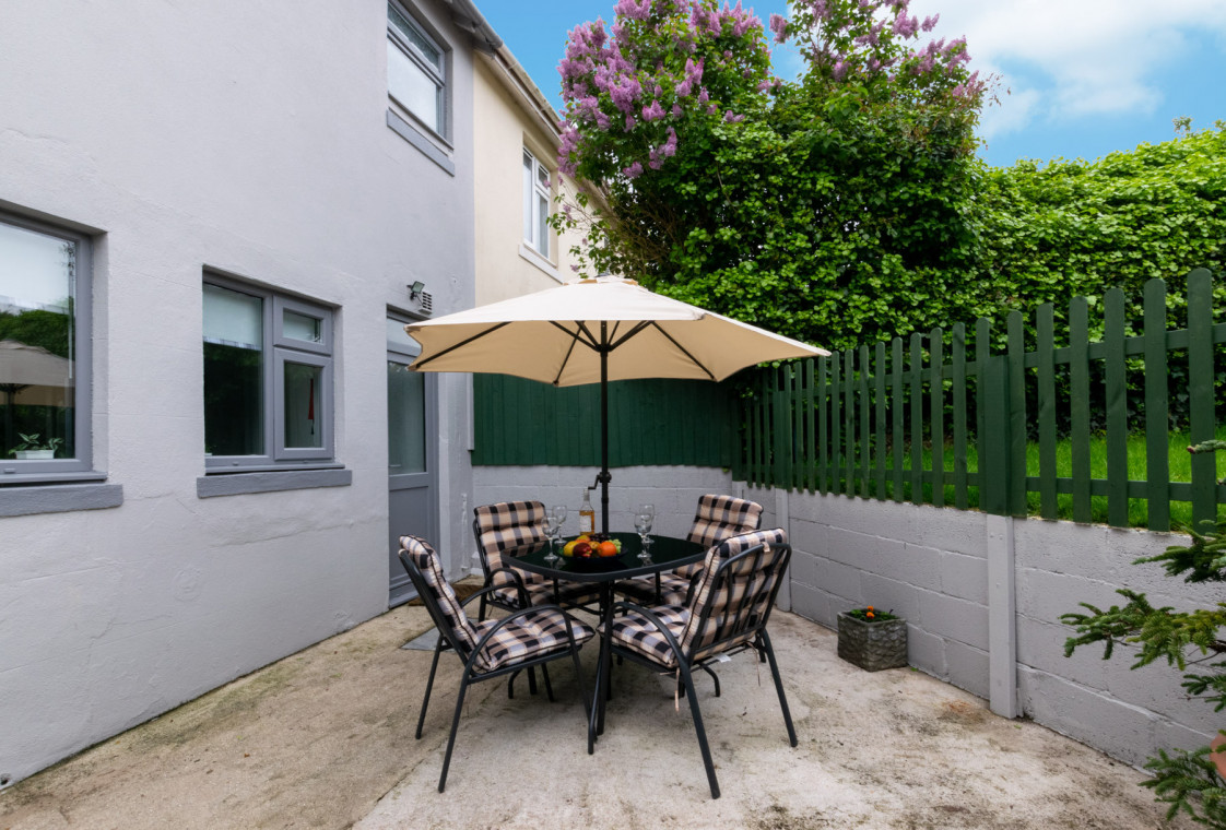 - Outside: fully enclosed courtyard garden with furniture.