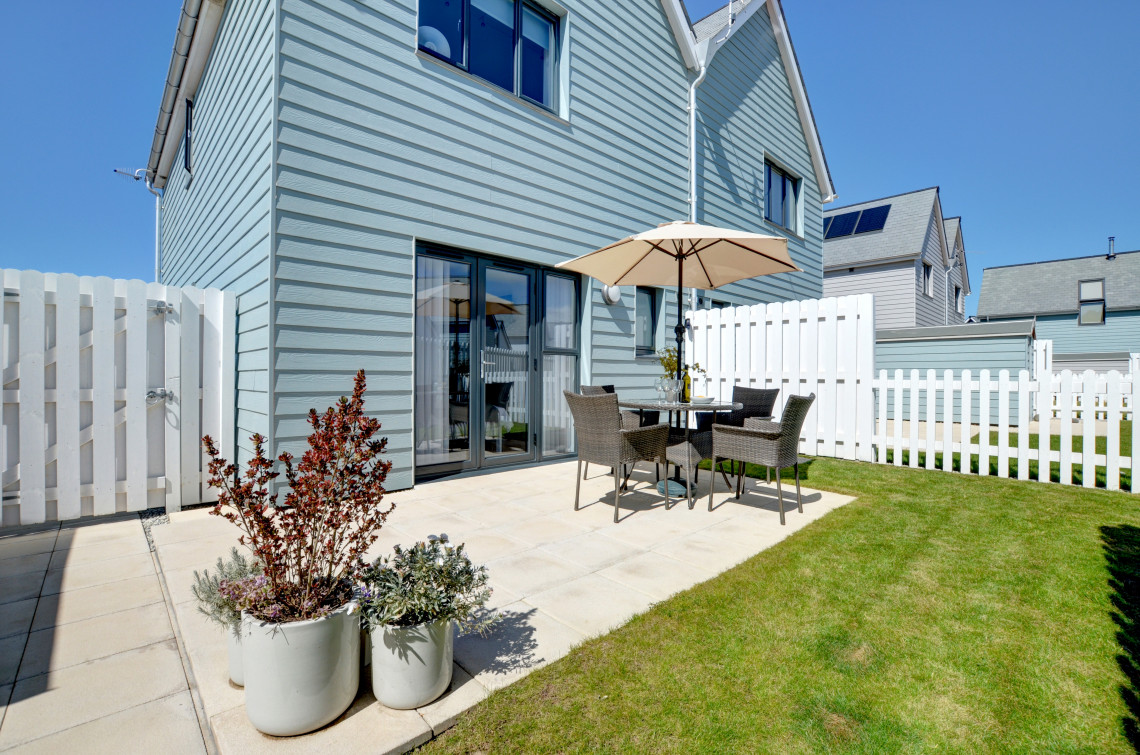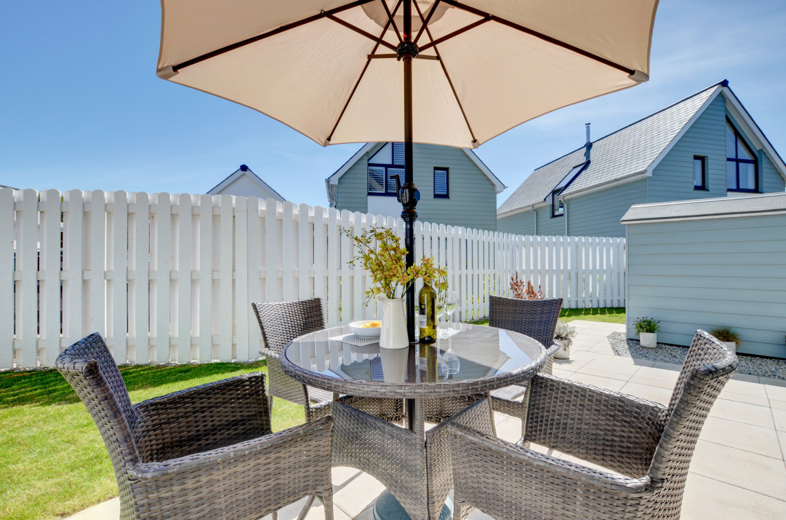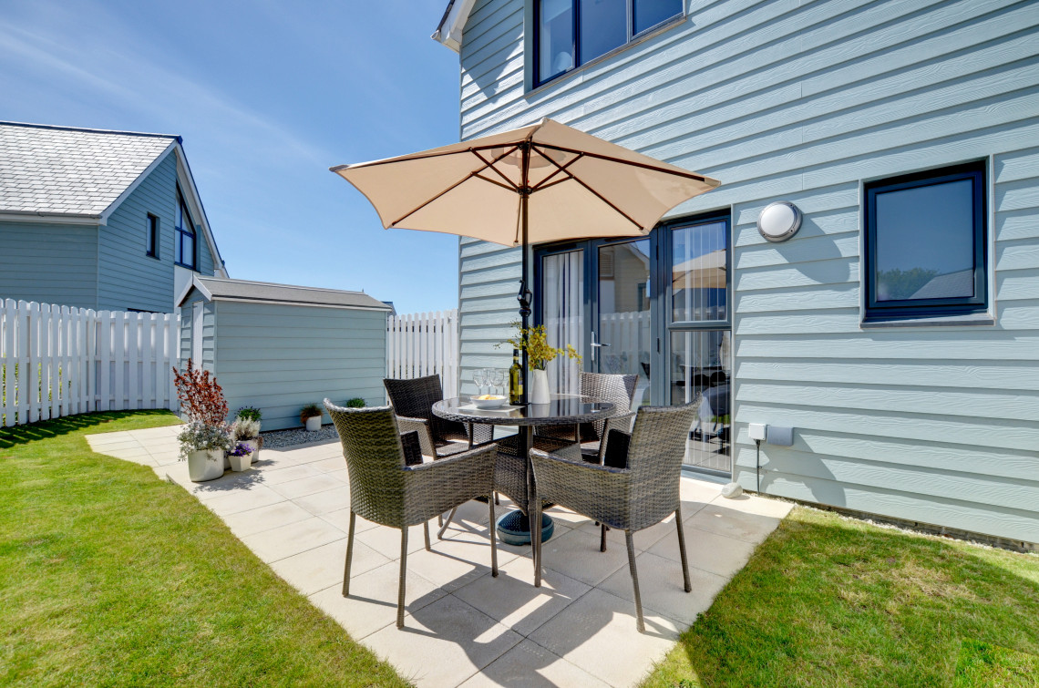 Outdoors: Enclosed patio garden with garden furniture and barbeque.