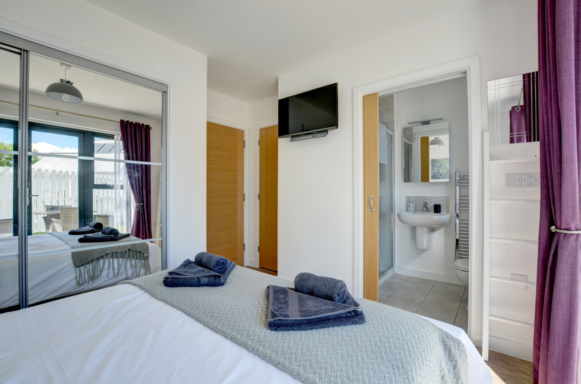 Rooms: 2 bedrooms one with ensuite shower room, bathroom shower over bath, WC and basin, open plan living/dining room, kitchen area