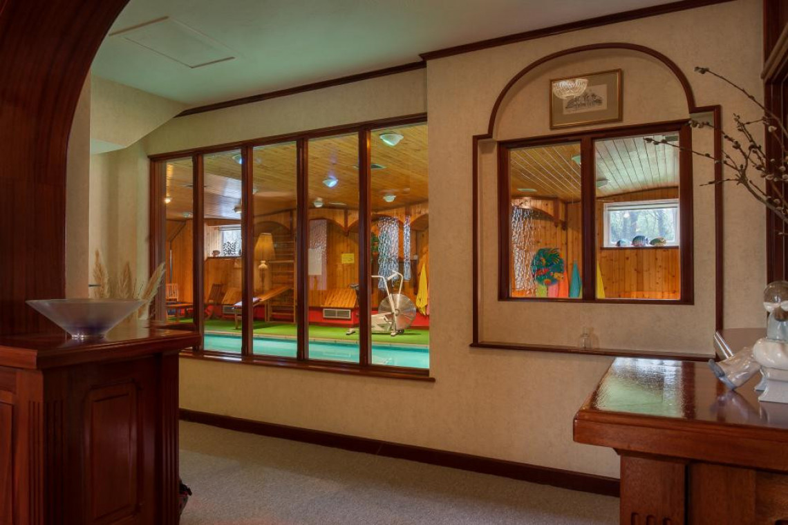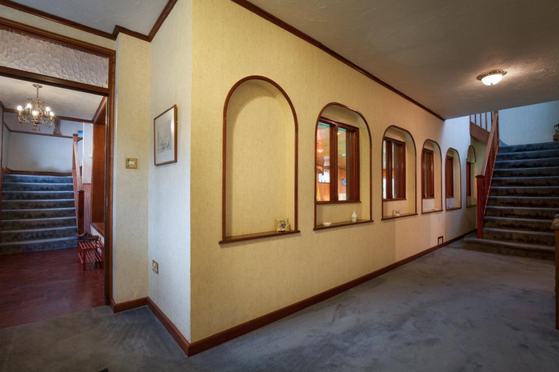 Entrance Hall: Impressive stained glass window, stairs to the first floor and links with the inner hallway. Selection of arched windows with views over the indoor pool and the main staircase to the first floor. Lobby area with a decorative timber arch, built-in cupboards, display window and access to the pool.