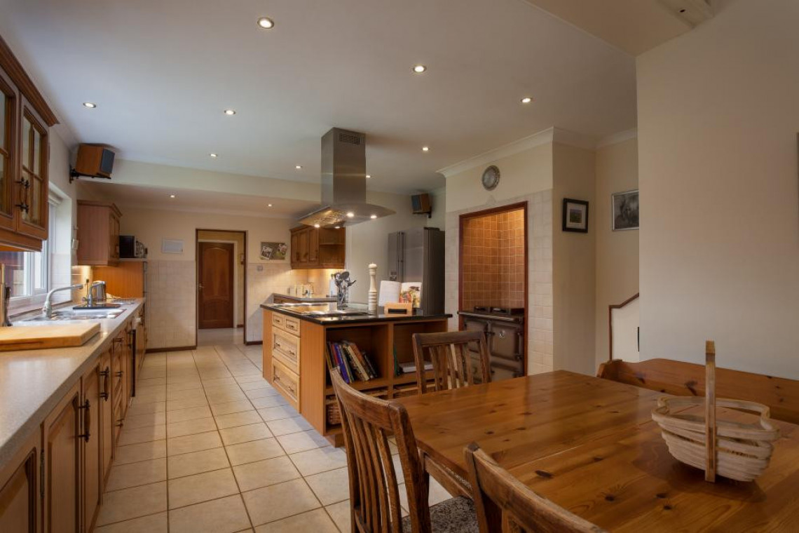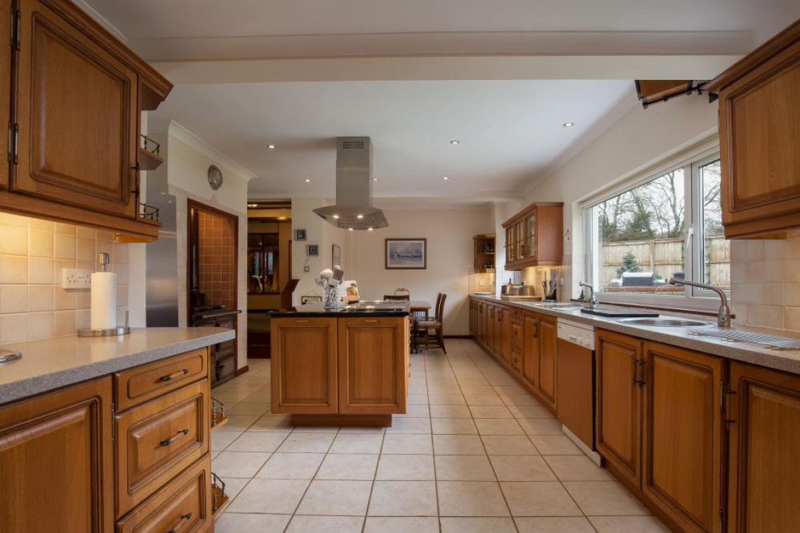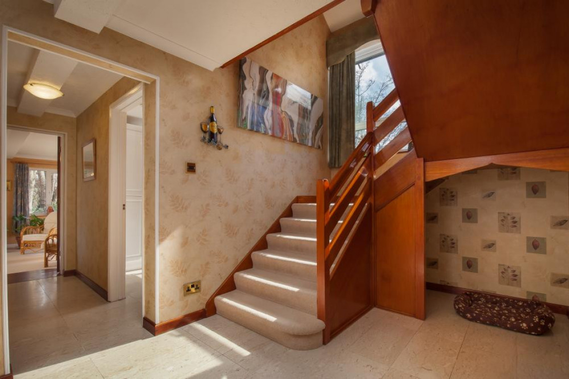 Leisure facilities: Pool room - an extensive hall with pine panelled walls, spotlights, feature stained glass window, heated pool measuring 39' x 15' depth from 2'6" to 5' to 4' (both ends of the pool are the shallow points with the deepest zone in the middle). There is a gym area by the pool with cross trainer, rowing machine and exercise bike. Sauna and cloakroom.