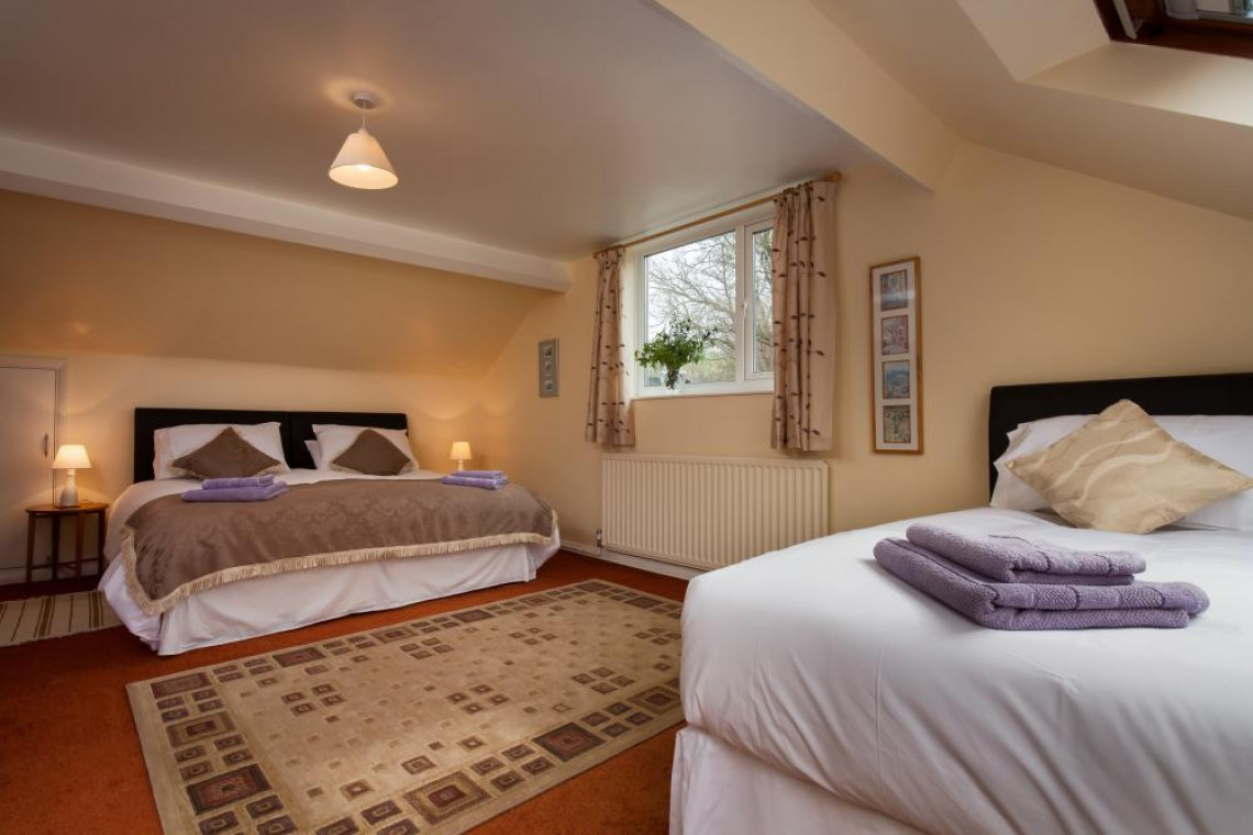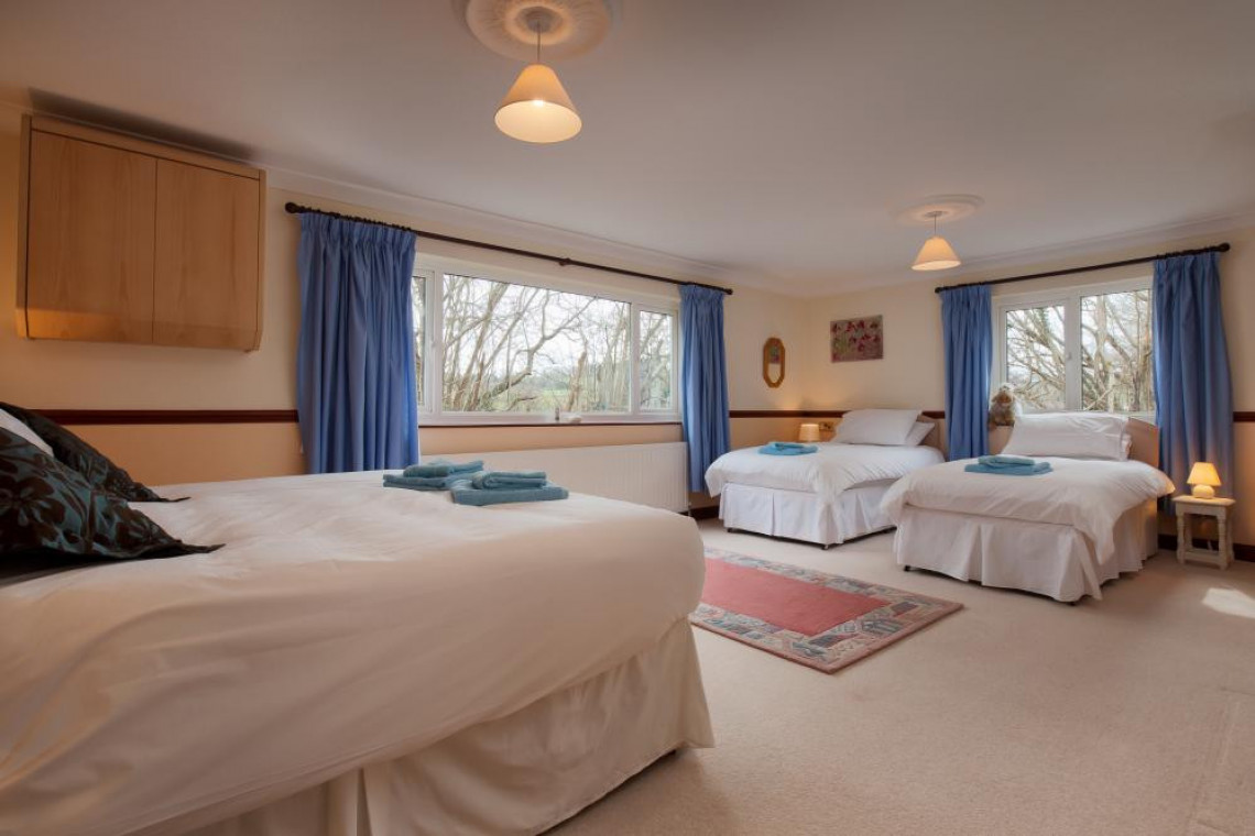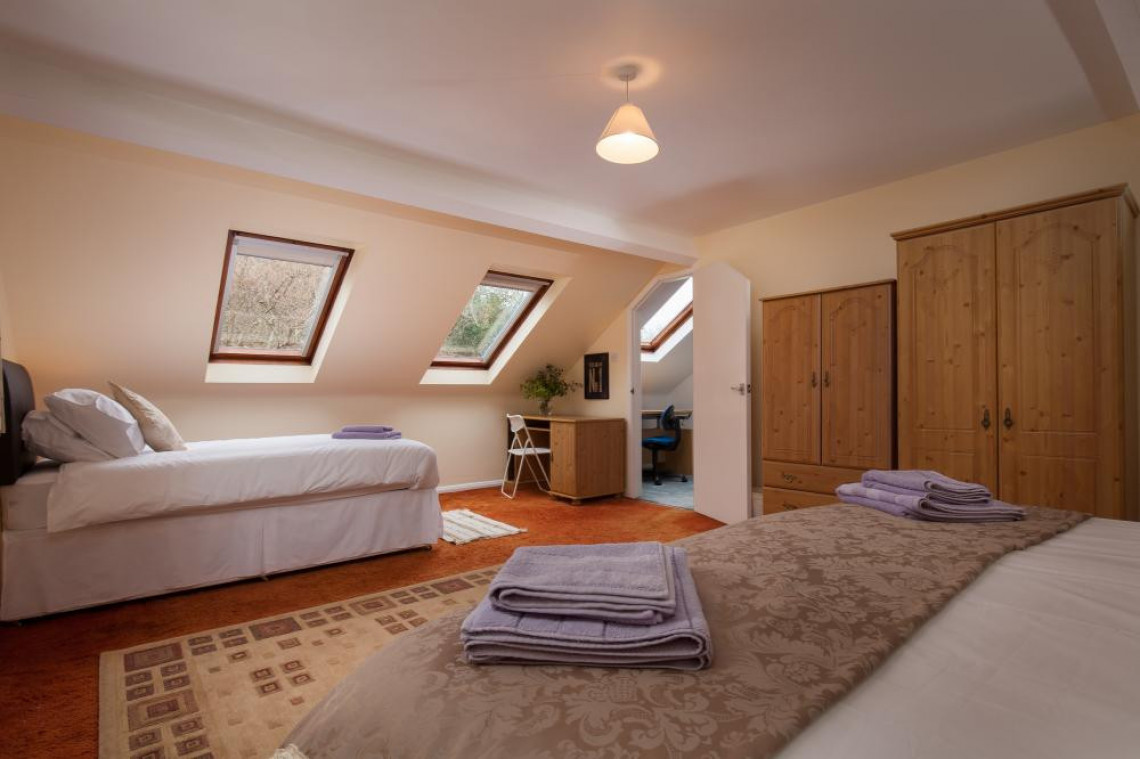 Sarah's Bedroom No. 6 is 1 x 6' zip n' link Super Kingsize bed + 2 x 3' single beds (4 guests) with en-suite shower room.