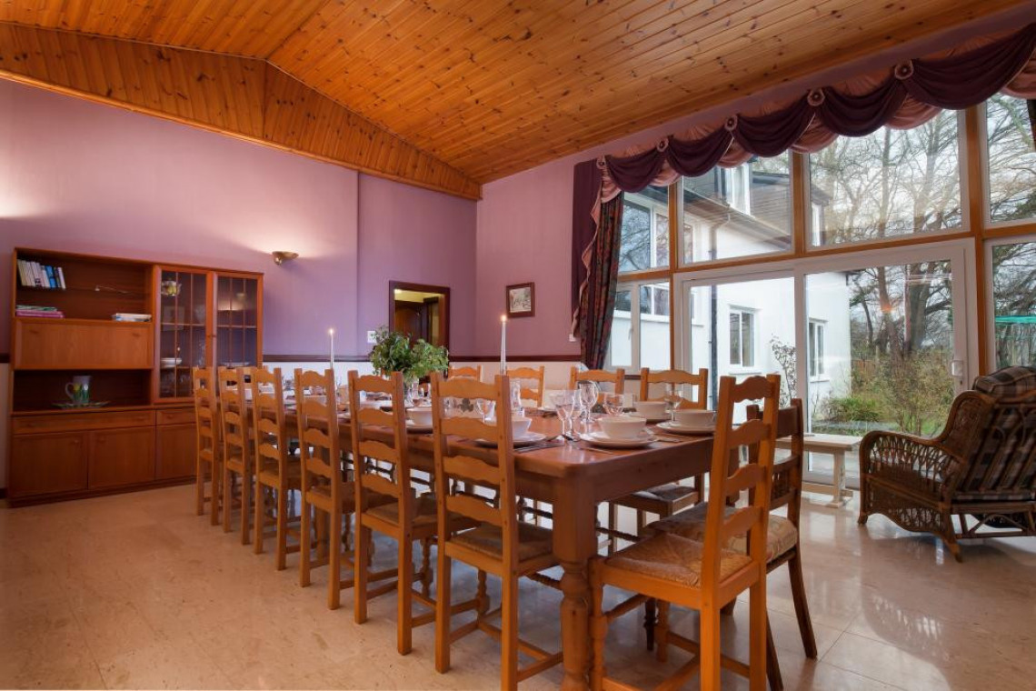 Dining Hall: Vaulted pine panelled ceiling, tiled flooring, extensive windows, sliding patio doors leading out to the garden, table and chairs which can seat 16 guests.