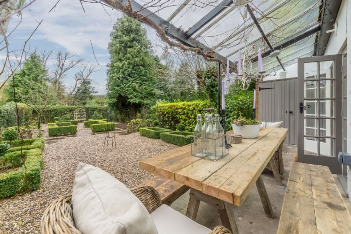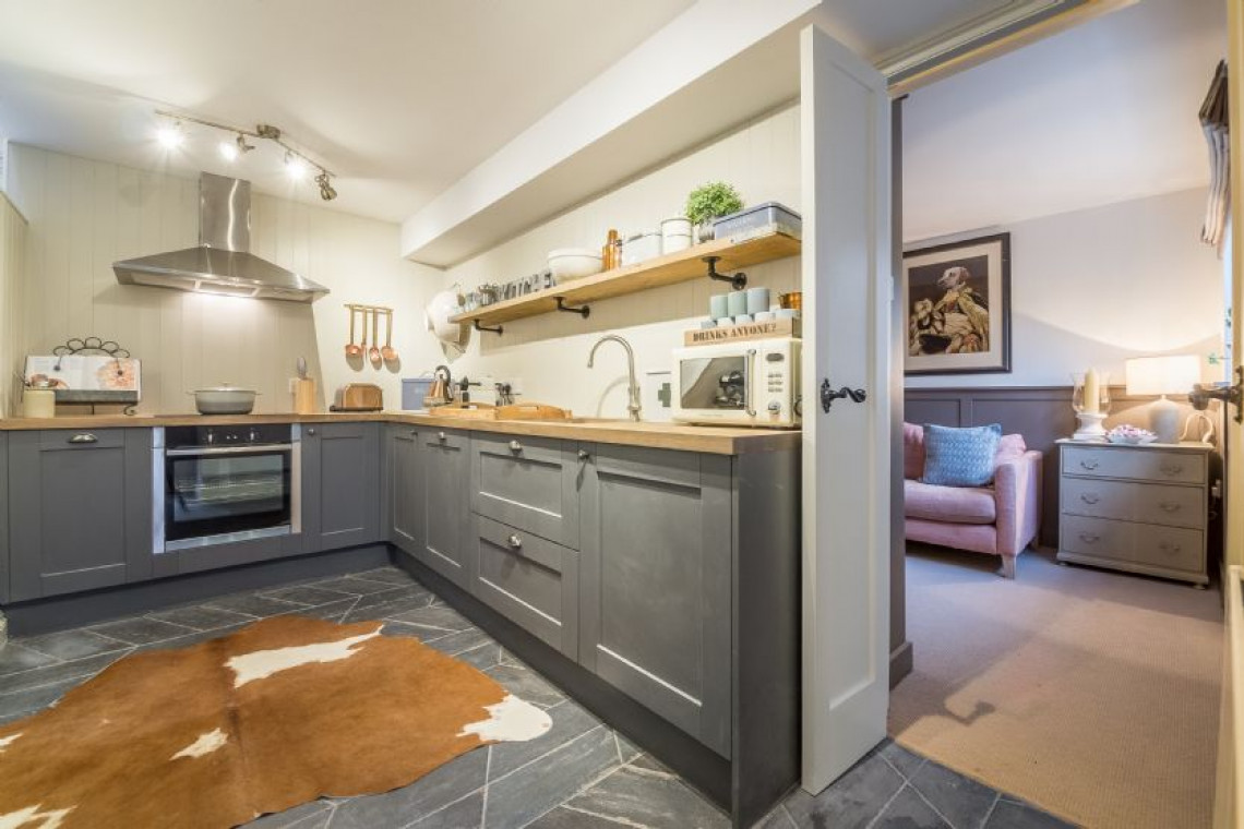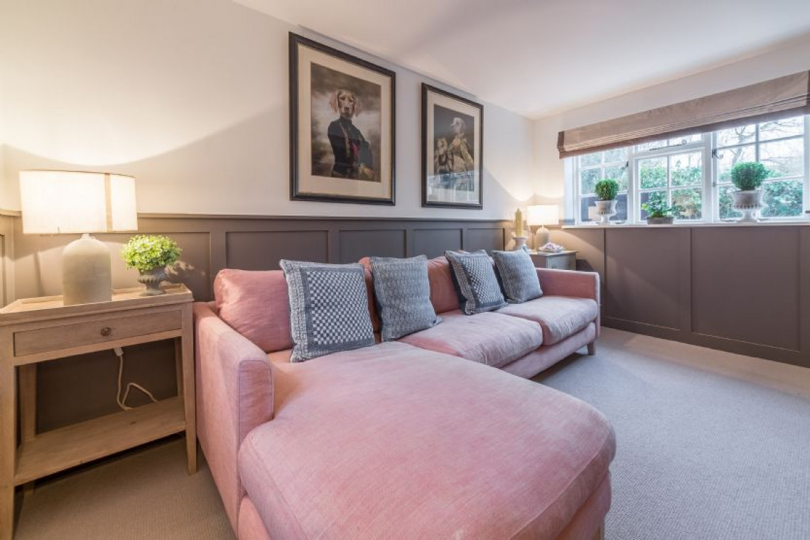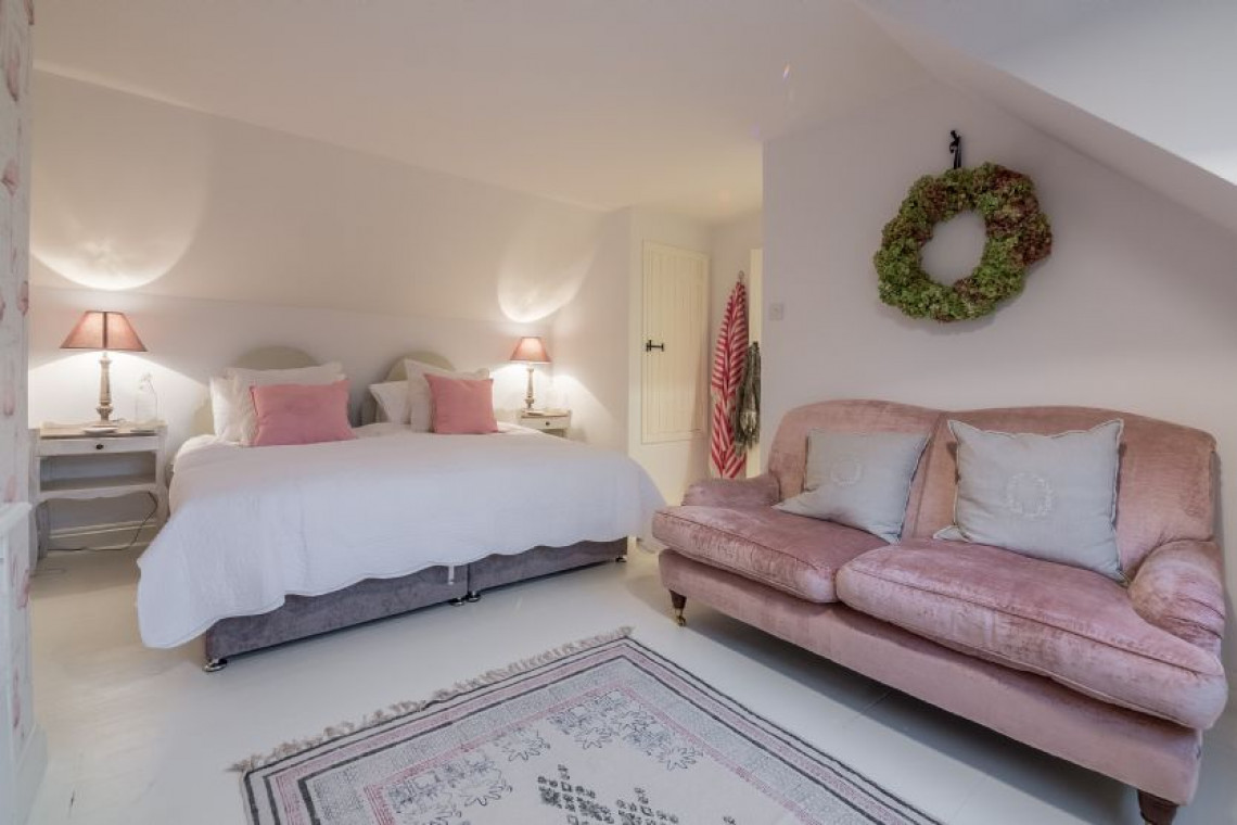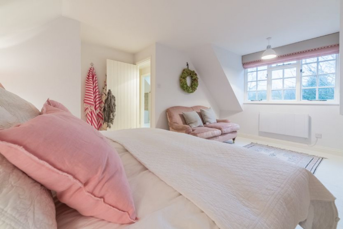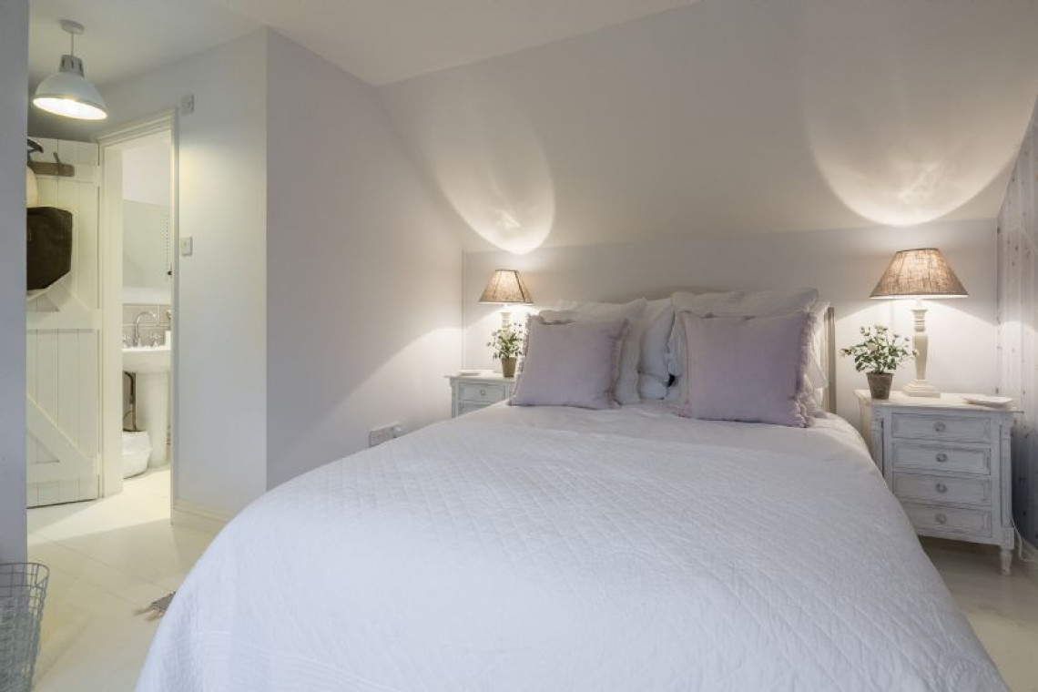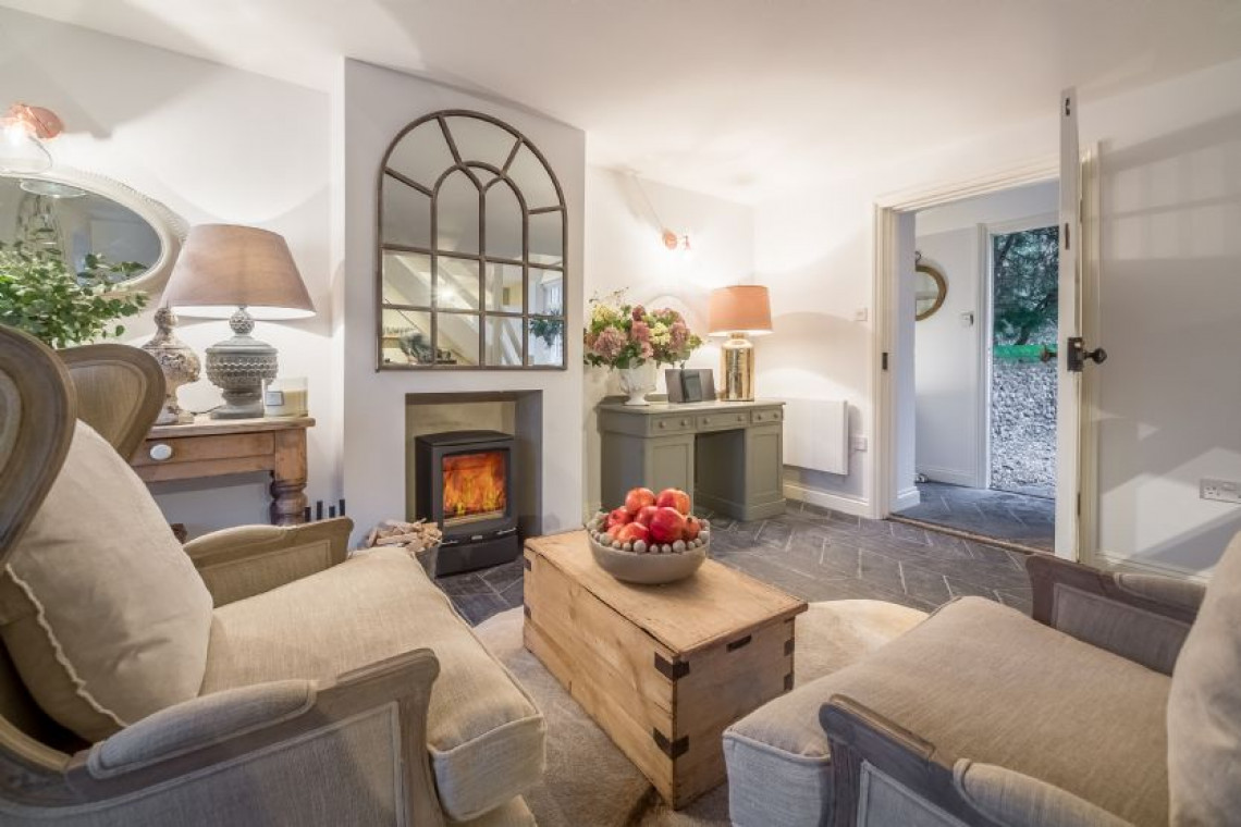 Enter the front door and walk into an open-plan, light-filled living space combining the kitchen, a dining area and an elegant, but cosy seating area around a wood burning stove (pour a glass of wine, open a good book and take a pew). Double french doors lead out onto the terrace (with glazed canopy and bespoke dining table) and pretty parterre garden, with open rural views beyond. At the rear of the room, a door opens into a wonderful chill-out, dual aspect snug/cinema-style tv room, with sumptuous four-seater sofa and widescreen television inset into library shelving and door opening onto the patio. Upstairs are two glamorous bedrooms (king-size and super-king zip-and-link, both dressed with high thread count linen) and two bathrooms.