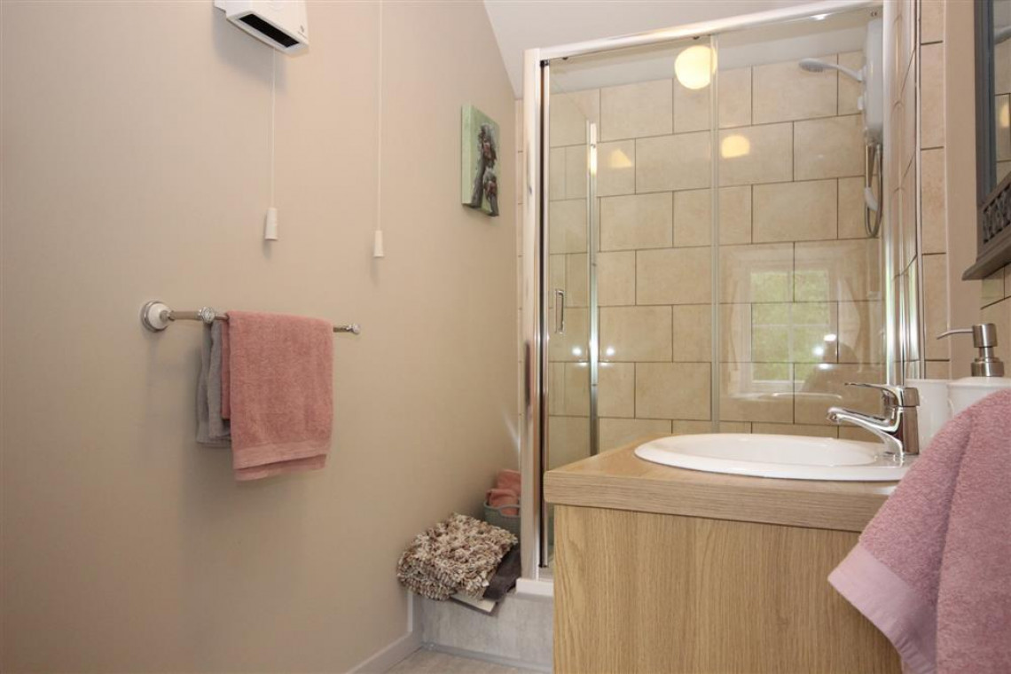 Off the living room is a good size carpeted double bedroom with attractive brass bedstead. A single wardrobe with ample drawer space and door hooks is provided. The spacious shower WC ensuite has an oversized shower cubicle (one deep step up) and basin with storage provision for toiletries.