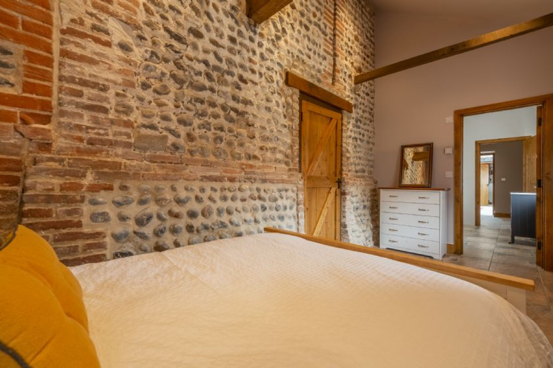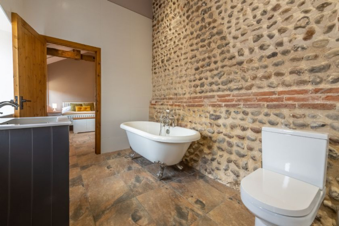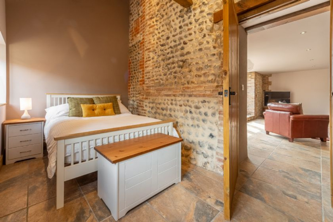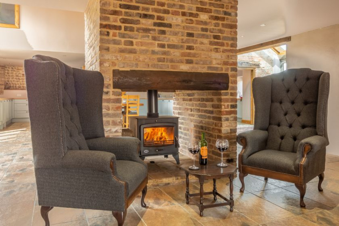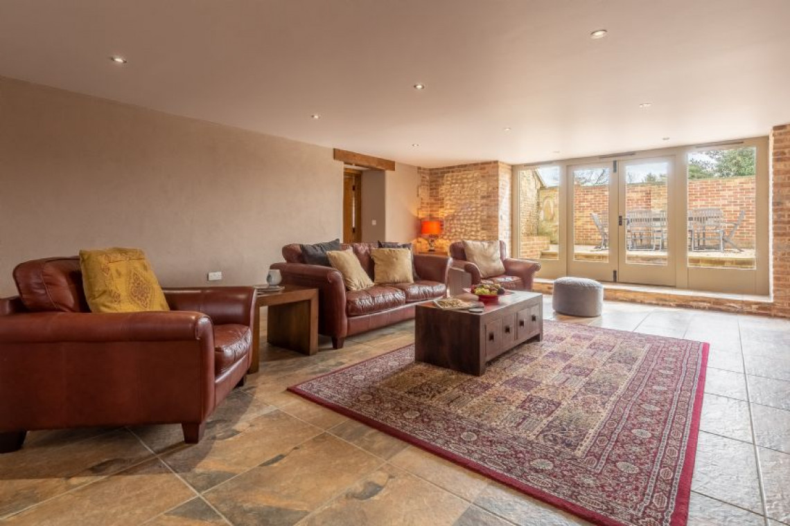 This beautiful barn conversion has been sympathetically restored with top quality modern appliances, a well-equipped kitchen which opens out into a large open-plan dining/sitting room with a double-sided wood burning stove and french doors opening onto an enclosed garden - ideal to keep children and your four-legged friends safe. There is also a further terrace/ courtyard off the sitting room, a perfect spot for a morning coffee or lunch time and evening al fresco dining. Underfloor heating throughout the ground floor, quality furnishings and beautiful bathrooms all help create a luxurious feel. The ground floor has one double bedroom and family bathroom, while the first floor has three en-suite bedrooms: a super-king, king and a twin. The Cart Shed annexe, all on one level (ideal for elderly relatives), with its own gorgeous open-plan living space, kitchen and wet room has a king-size bed.