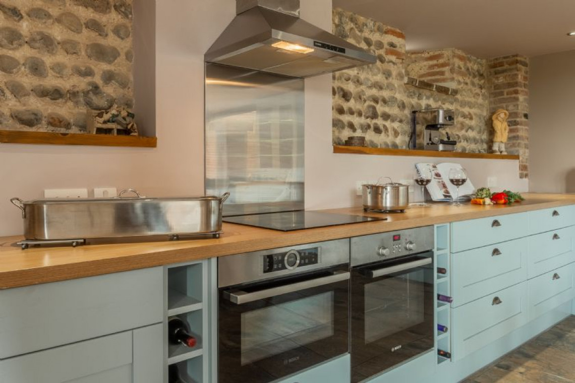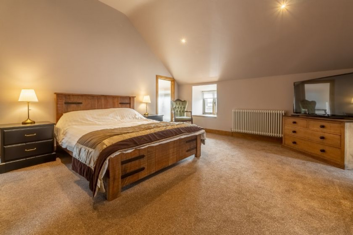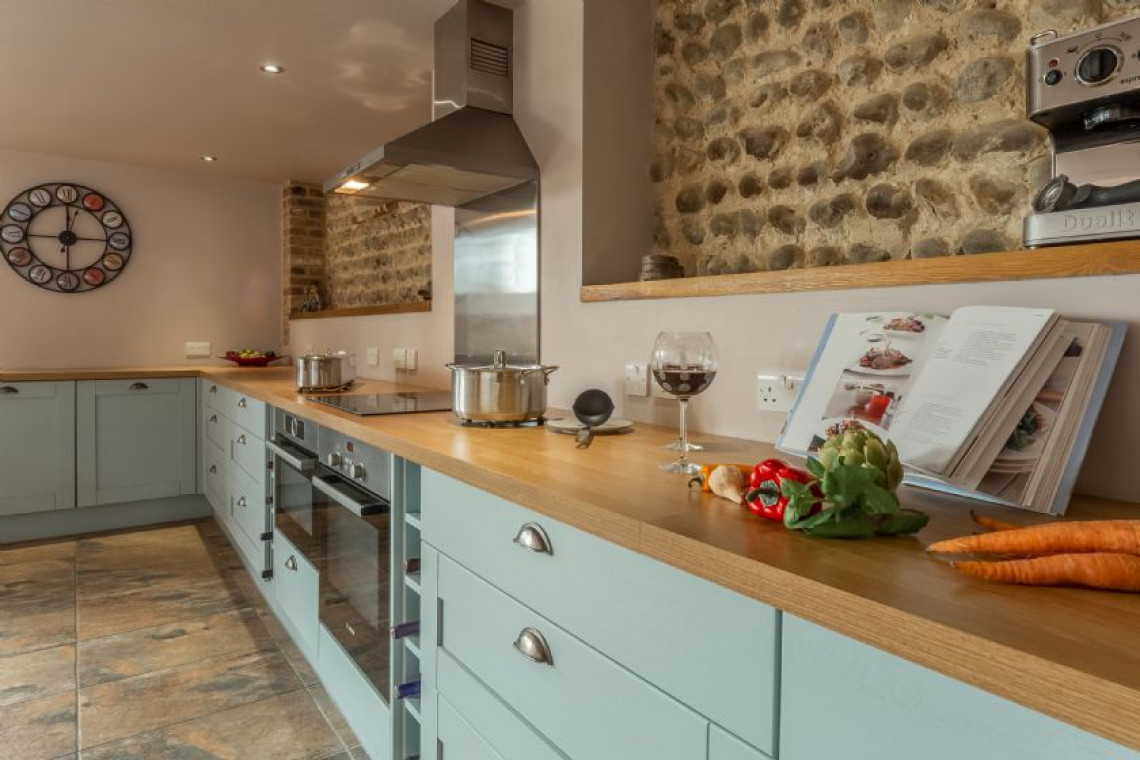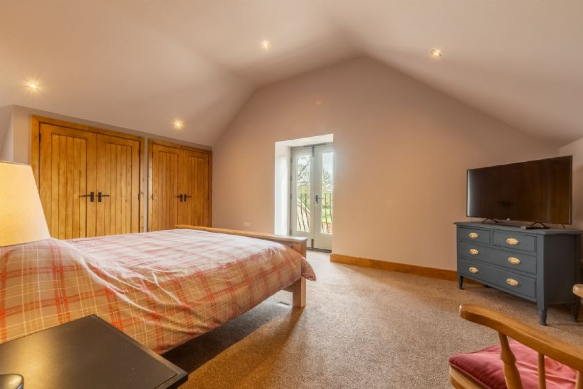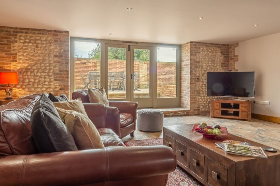 This beautiful barn conversion has been sympathetically restored with top quality modern appliances, a well-equipped kitchen which opens out into a large open-plan dining/sitting room with a double-sided wood burning stove and french doors opening onto an enclosed garden - ideal to keep children and your four-legged friends safe. There is also a further terrace/ courtyard off the sitting room, a perfect spot for a morning coffee or lunch time and evening al fresco dining. Underfloor heating throughout the ground floor, quality furnishings and beautiful bathrooms all help create a luxurious feel. The ground floor has one double bedroom and family bathroom, while the first floor has three en-suite bedrooms: a super-king, king and a twin. The Cart Shed annexe, all on one level (ideal for elderly relatives), with its own gorgeous open-plan living space, kitchen and wet room has a king-size bed.
