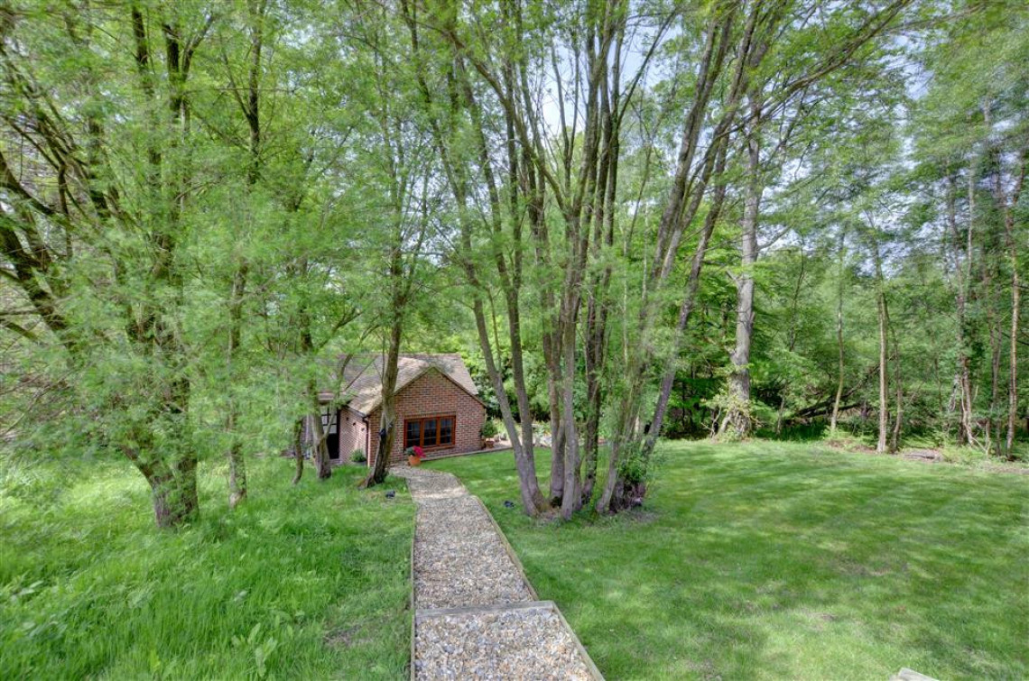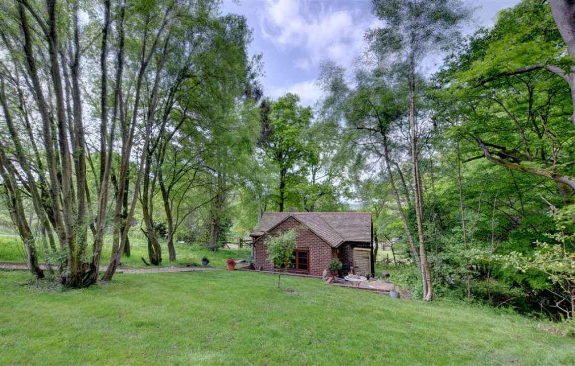 Outdoors: Private patio with garden furniture and woodland garden beyond