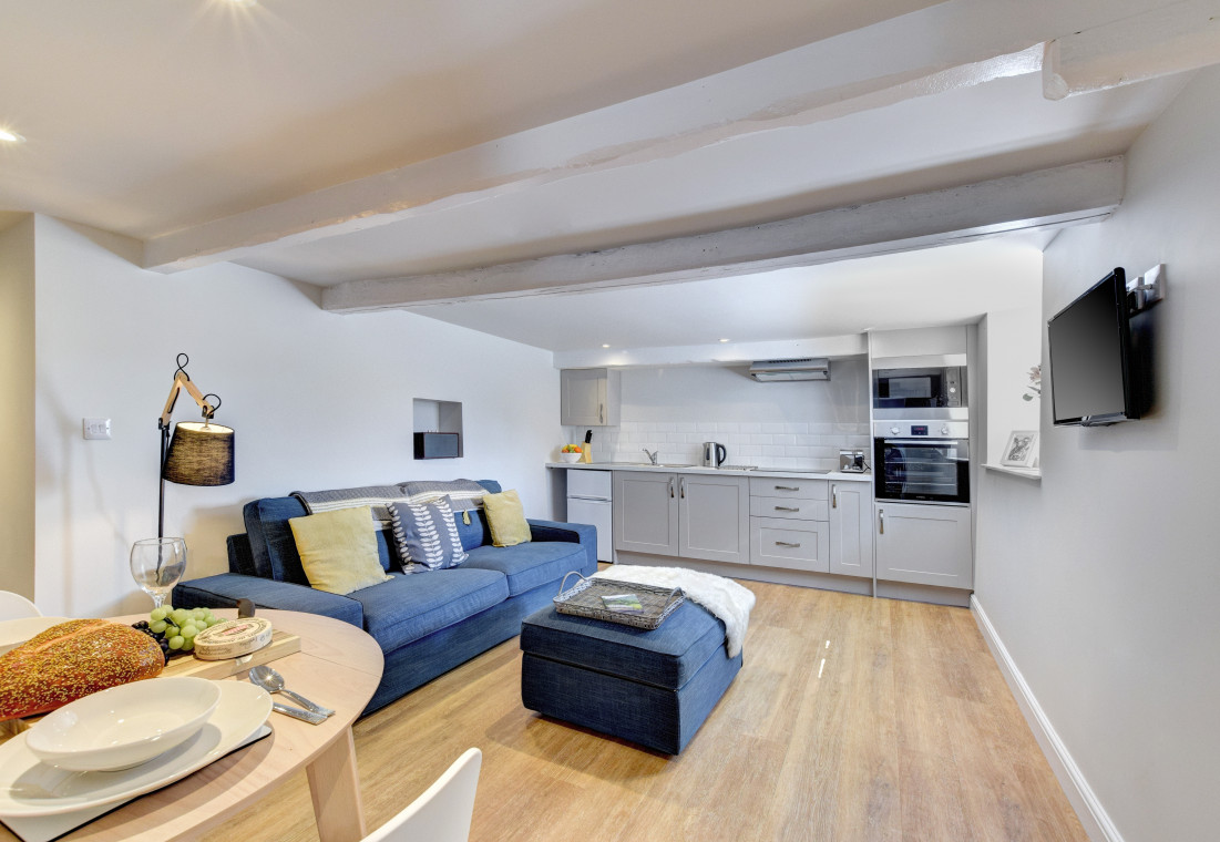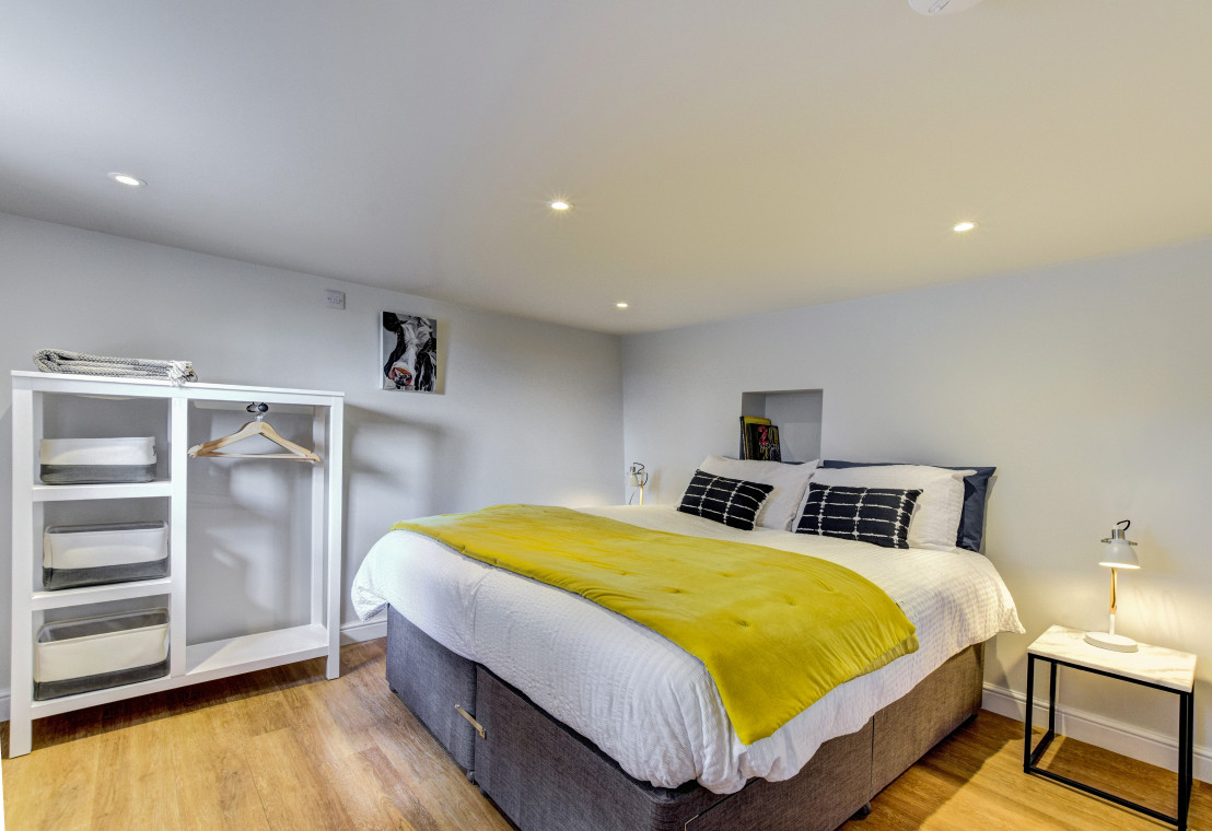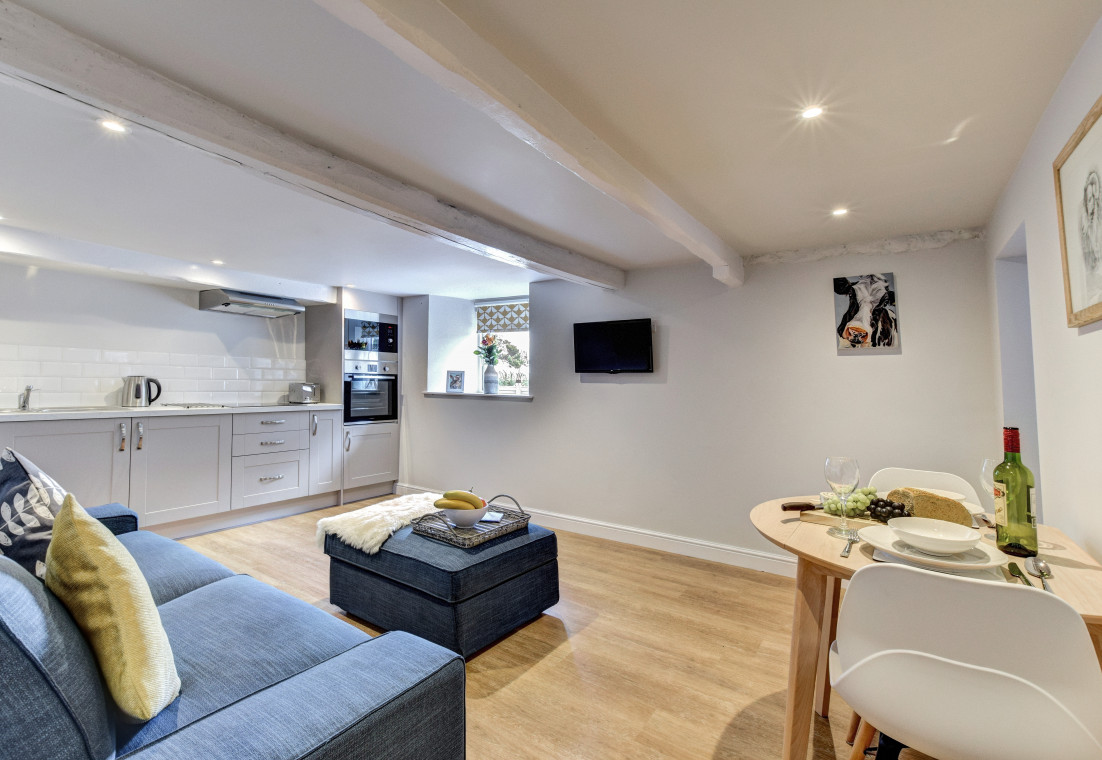 Down the stairs, you have the open plan kitchen and living area, although technically a basement room you have fantastic views of the garden and the fells beyond. As this is an old building the headroom to the lower area is quite low so you will need to be careful (watch your head!). The kingsize bedroom is located just off the living area and has a window with garden views. Underfloor heating keeps you nice and warm.