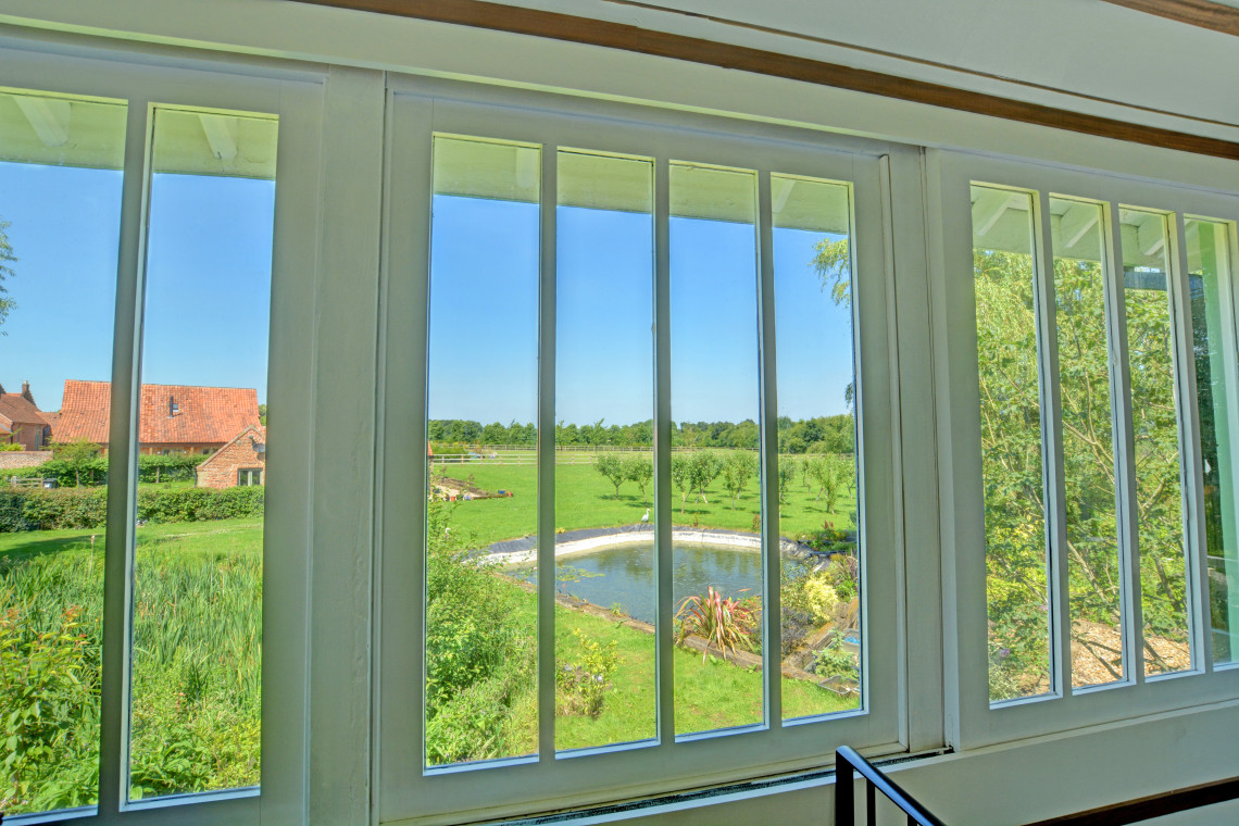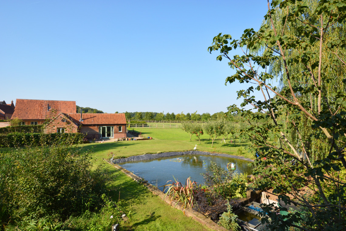 - Outdoors: Lawned garden with uncovered ponds, garden furniture and barbeque