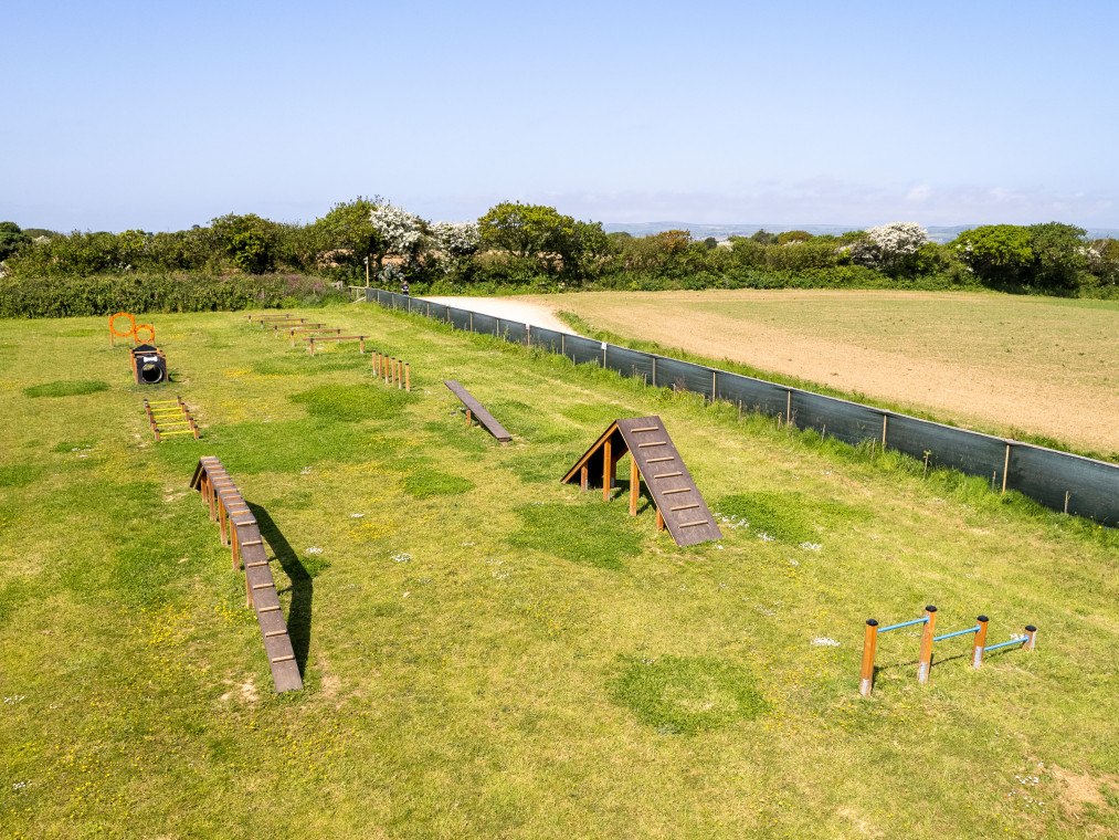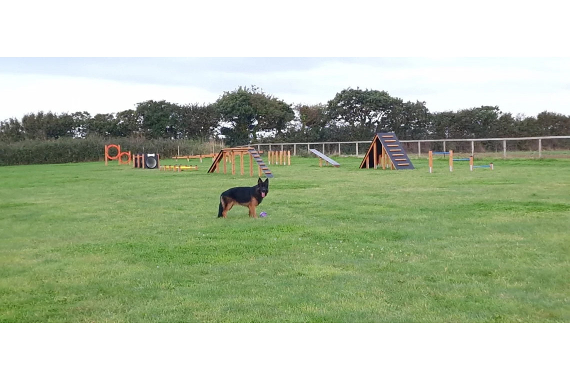 Our Dog friendly facilities are second to none in the Country, and we won the GOLD award for the Most Dog Friendly business in Cornwall 2022/23 from Cornwall Tourist Board awards, and the GOLD award from the Internationally recognised Green Tourism Industry in 2024 for being eco friendly too! We have a TWO fenced 2m high exercise fields, one can be booked online for exclusive access with permanent fixture agility equipment for doggie playtime and enrichment. There are further tracks and paths through the wild-flower meadows and fairy woods for off lead walks too. There are no farm animals nearby. There are warm outdoor showers in each enclosed garden (fence is 1.5m high), and a doggie treat box in each cottage. Dogs may go on the sofas as they are wipe clean leather, and the floors downstairs are easy to clean too. There is a stairgate that can be pulled across the stairs although they are allowed everywhere, you wont want them upstairs when wet. Large and Medium crates are available to borrow for free. Exempted dogs under the DD Act will need to keep their muzzles on whilst in the gardens and fields and are must be kept under their owners close supervision at all times.