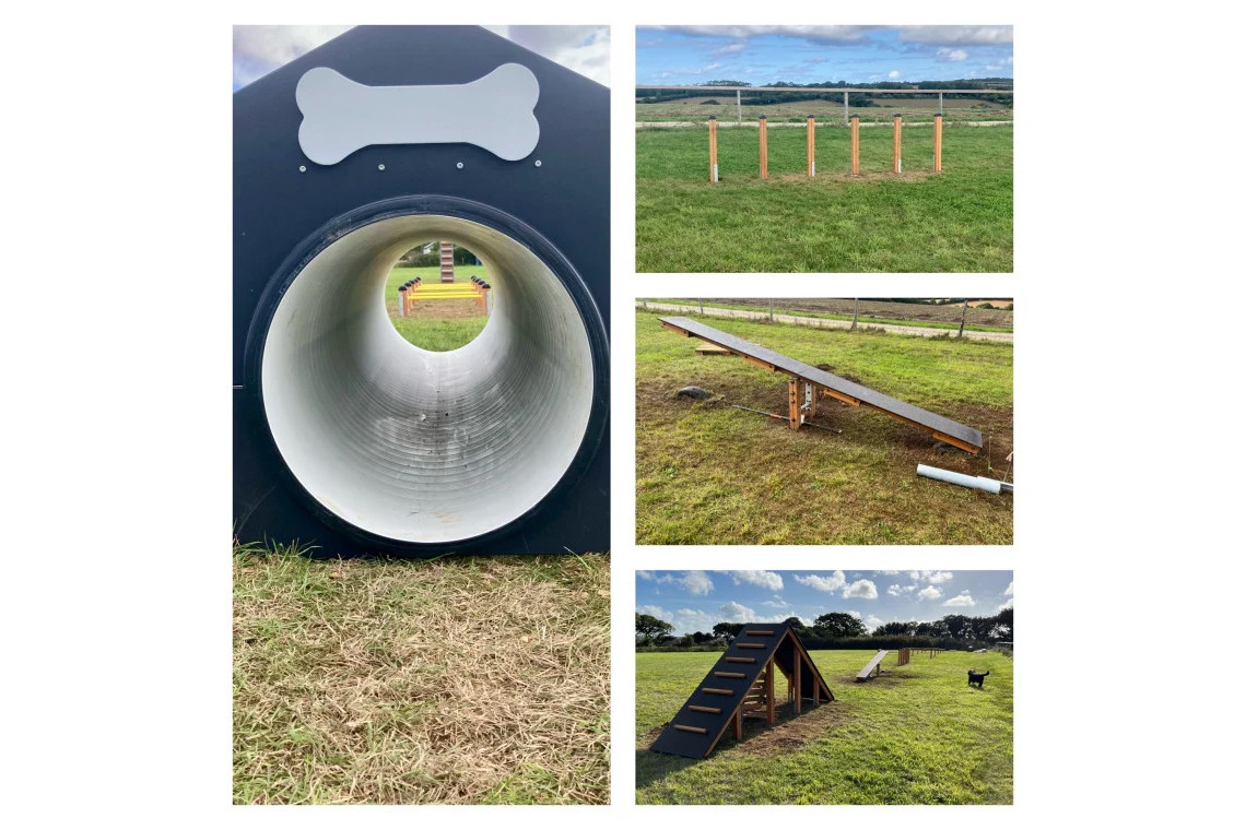 Our Dog friendly facilities are the best in Cornwall and we WON the Cornwall Tourist Board ‘Most Dog Friendly Business in Cornwall’ Gold award 2022/23. We have TWO secure grass paddocks. One is free for our guests to use and the other is open to the public and is bookable online. This one has permanent fixture agility park equipment for doggie playtime and enrichment. There are further tracks and paths through the wild-flower meadows and fairy woods for off lead walks too. There are no farm animals nearby. There are warm outdoor showers in each enclosed garden (fence is 5 feet high), and a doggie treat box in each cottage. Dogs may go on the sofas as they are wipe clean leather, and the floors downstairs are easy to clean too. If dogs are required upstairs, please arrange at time of booking. There is a stairgate that can be pulled across if not. Large and Medium crates are available for free.