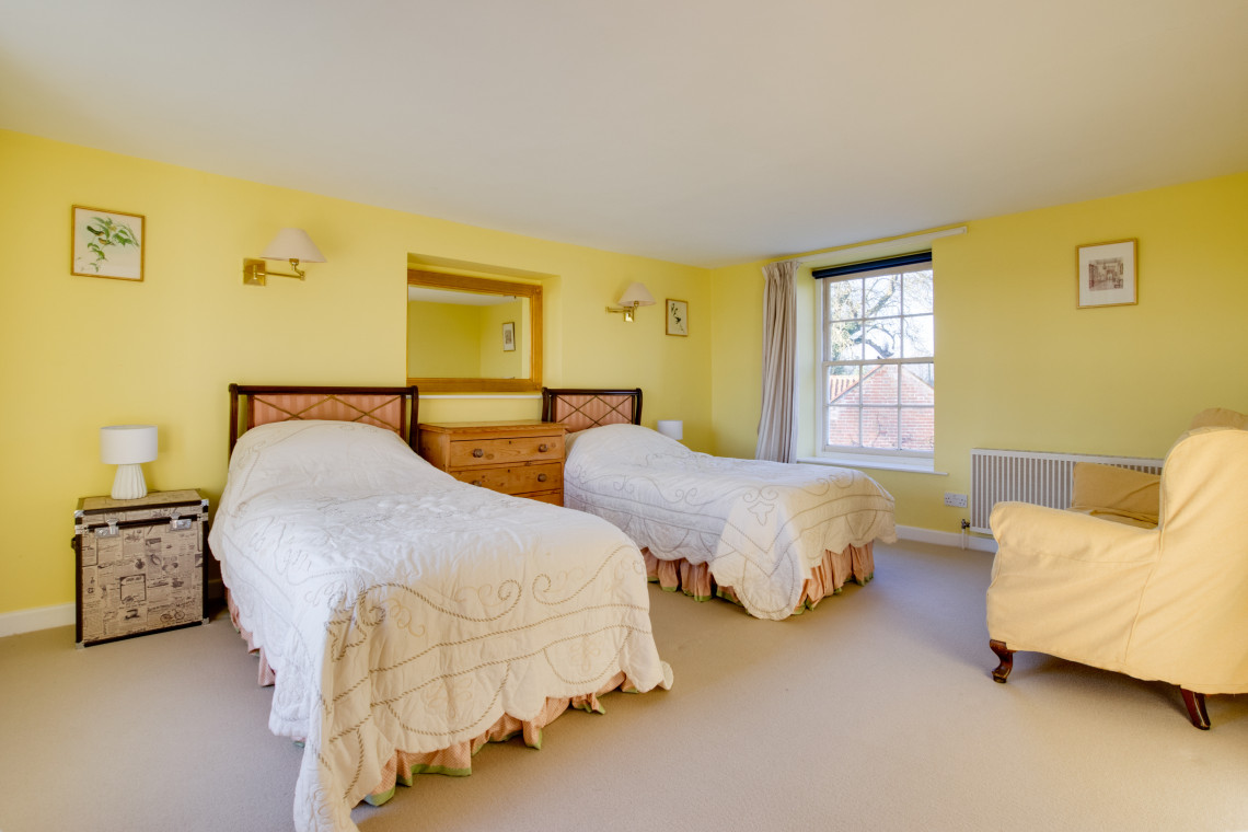 Bedroom 3: Twin beds, bedside tables, lamps, chest of drawers and wardrobe.