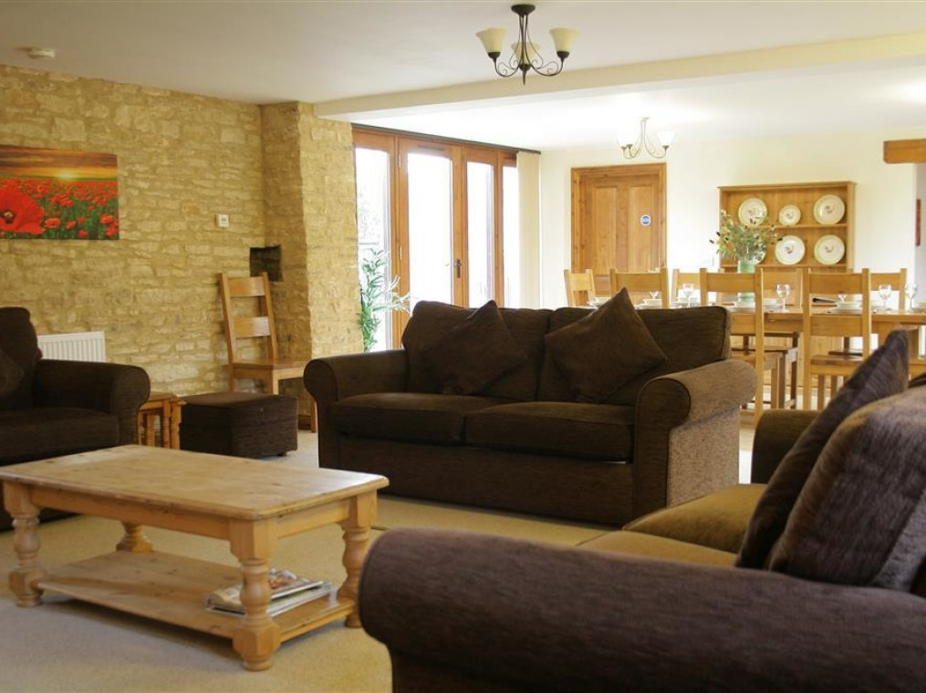 Tithe Barn, Lyneham is a superb choice for a large gathering of friends or family looking to be located right in the heart of the Cotswolds and within a very comfortable and spacious barn conversion. We see it as the ideal choice for a family country holiday given its surroundings, tucked down a very quiet lane on the edge of small village. Set on a working farm within a small Cotswolds hamlet, the barn has nearby access to the rolling countryside of the Oxfordshire Cotswolds. Over the years guests have regularly returned to Tithe Barn (which is a very good sign) and we suspect it is because it has a wonderful open plan living space which is absolutely ideal for entertaining. The owners who are around the corner and happy to give advice and ideas on what to do locally have worked hard to make this an attractive destination and together the property and the classic countryside surroundings make it perfect as a get-a-way choice. Internally the barn has been well renovated and provides superb facilities and touches including the enormous windows in the centre of the building. Externally this English Country barn has an enclosed garden and access to brilliant walks in every direction. An absolute favourite with our customers, and you can see why. Four bedrooms: 1 x king size (zip/link can be twin) with ensuite WC and washbasin ( no shower ), 1 x King size, 1 x double bed ensuite shower Room with shower, WC and washbasin, 1 x double with ensuite shower Room with shower, WC and washbasin. Bathroom with bath, shower over, basin and WC, ground floor cloakroom with basin and WC. Kitchen. Living room with woodburner and double sofa bed available at extra charge. Dining area. Amenities for Rental Central heating, woodburner Electric hob, electric grill and oven, large fridge freezer, dishwasher, microwave, washing machine, tumble drier. Large flatscreen TV with Freeview, DVD player, WIFI. Fuel and power and inc in rent Bed linen and towels inc in rent. Cot and highchair available. Off road parking for max 5 cars. Enclosed garden with table and chairs, lawn, a large patio, furniture and a BBQ. One-two pets welcome at a charge of £25 per week. Sorry, no smoking. Shop 4 miles, pub 2 miles.