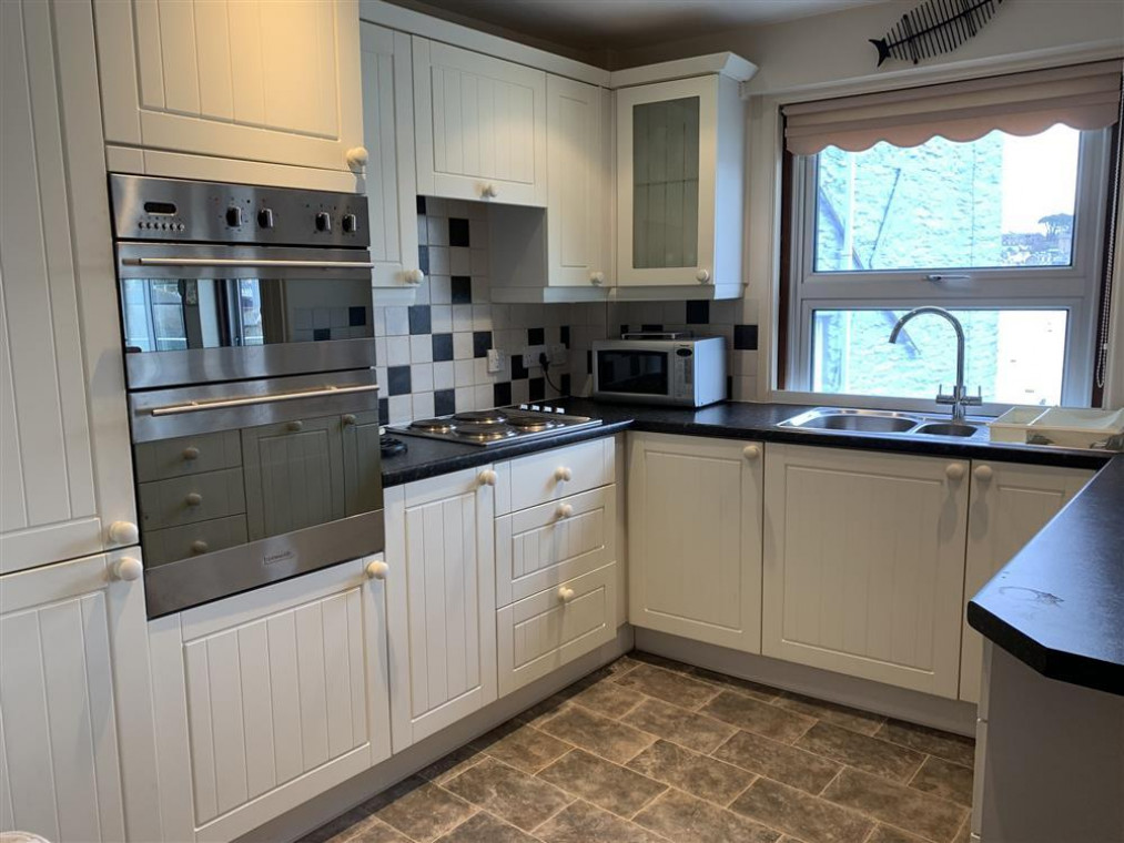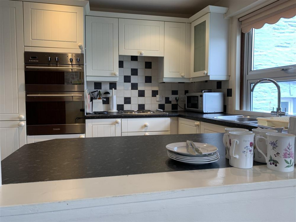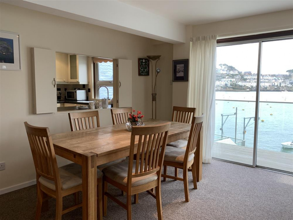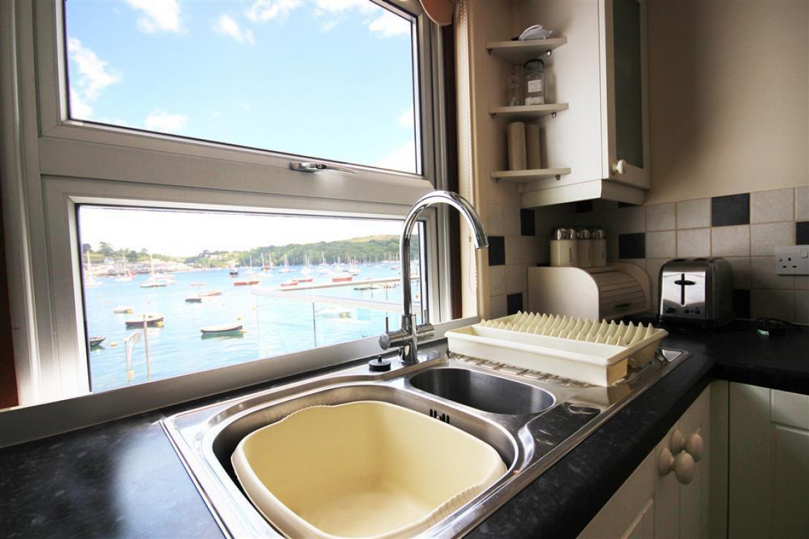 From the front the property is split level with seven wooden steps taking you up to the fitted kitchen with double oven and grill, built in fridge with separate freezer below, four ring electric hob and slimline dishwasher and microwave. A picture window gives you wonderful views over the Fowey Estuary and a useful serving hatch into the living space. From the kitchen a door opens into the living space with the most wonderful views across to Fowey and up the Estuary with two french doors opening out onto the deck enclosed by glass with outdoor furniture. An corner sofa makes the most of the views set in front of the fireplace with an electric fire. A wooden dining table and chairs are positioned by the serving hatch but also make the most of the views.