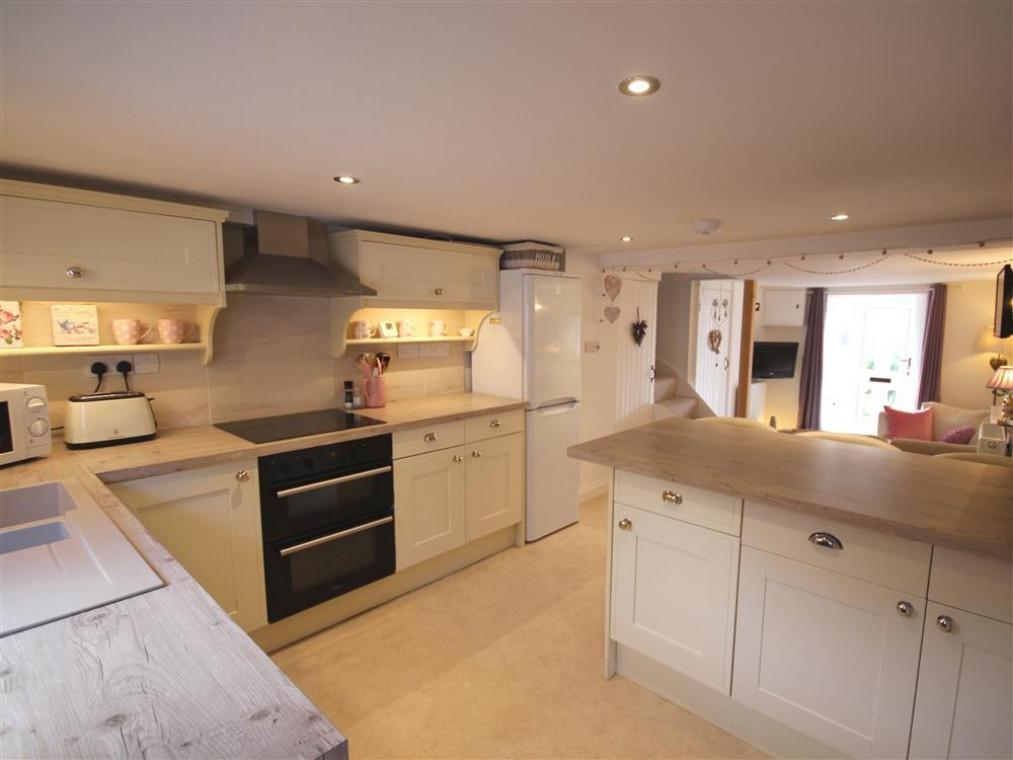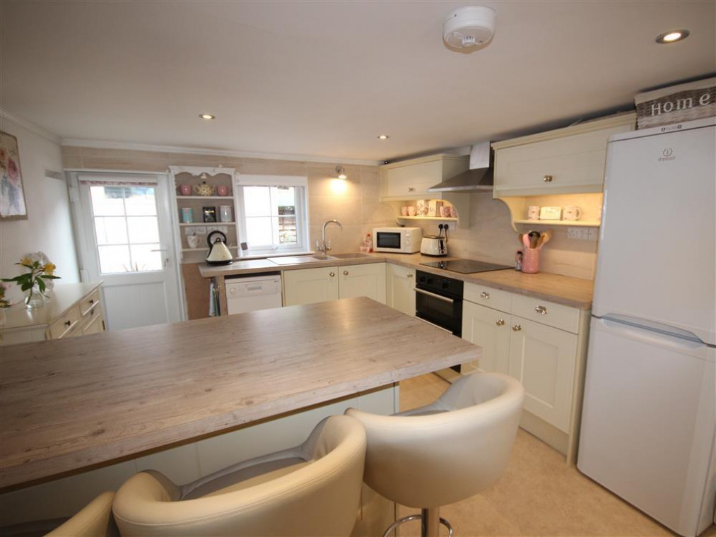 To the ground floor is the living space with open plan kitchen and dining area courtesy of a large breakfast bar with stools. There is a step up into the well equipped kitchen from the living room with a back door leading outside to the laundry room and garden.