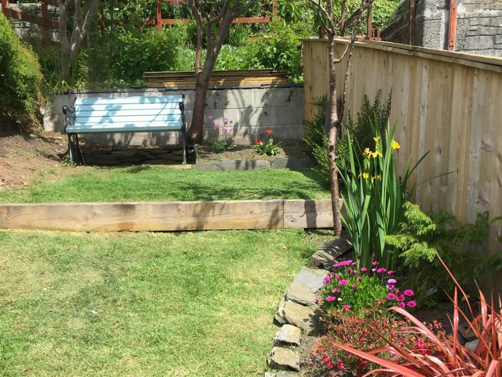A terraced, lawn and patio back garden (accessed by steps and not fully enclosed) belongs to the property and comes complete with garden furniture.