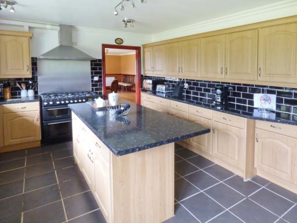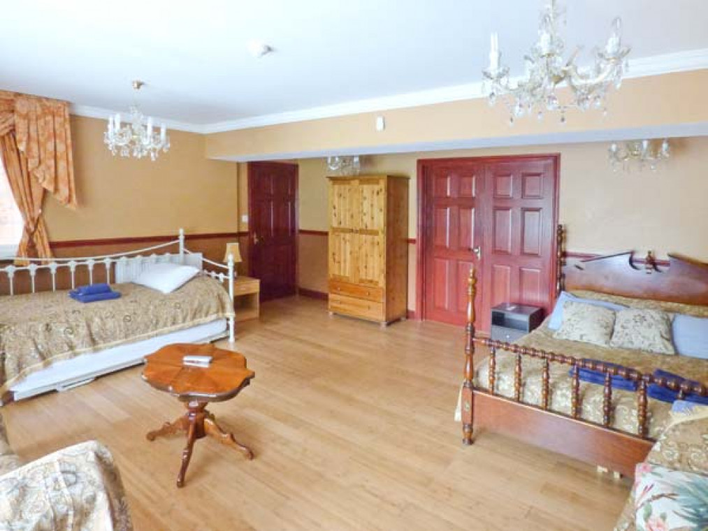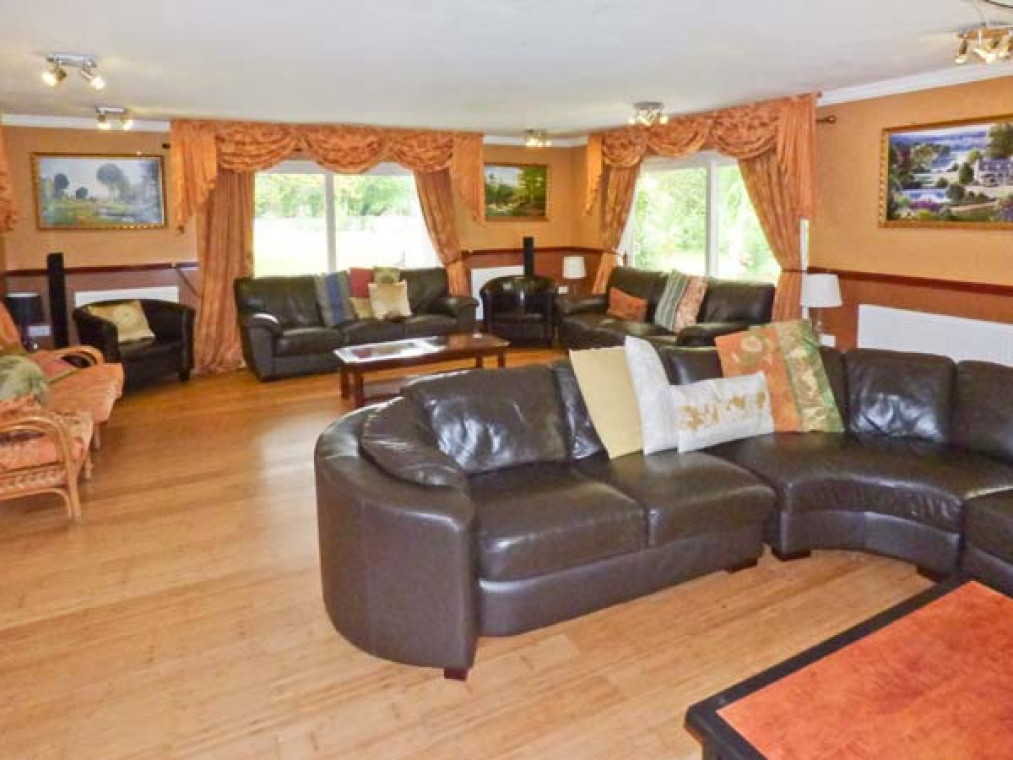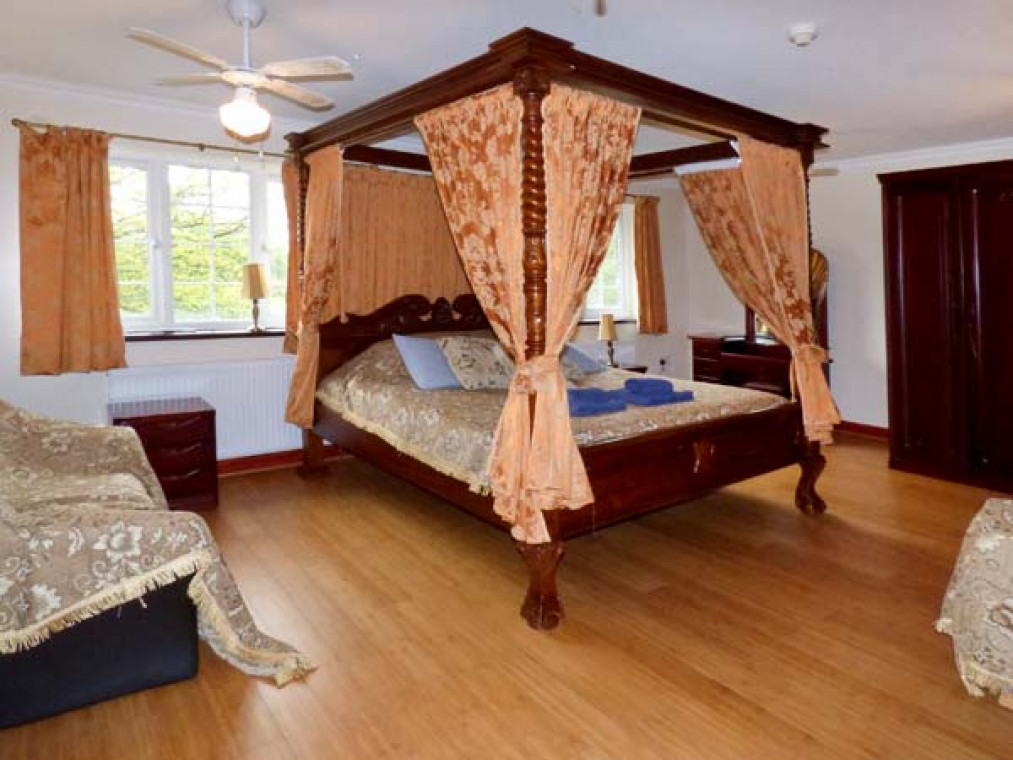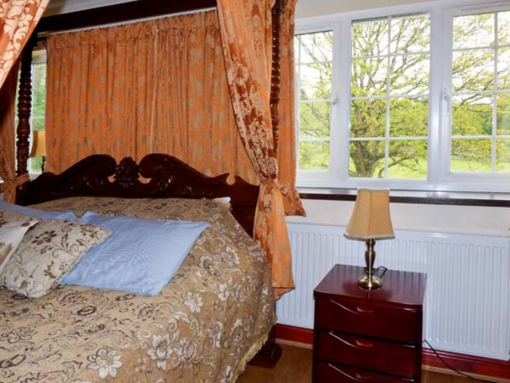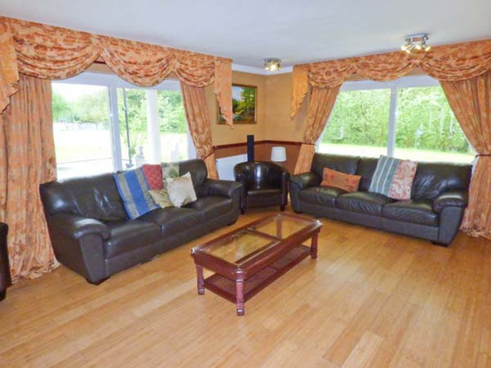 A modern, detached property nestled in a small river valley, near the residential village of Glanaman, just nine miles from Llandeilo. This striking holiday home is the perfect base for large families and groups of friends to relax and explore the surrounding countryside. Set over two floors, there are six large bedrooms, including one family room downstairs with a shower room adjacent, and five bedrooms upstairs with their own en-suite. On the ground floor is a large, well-equipped kitchen overlooking the spacious lawn, with an island unit, from which you can access a spacious dining room and enjoy home-cooked meals together. The dining room leads through into the ground floor family bedroom and on this floor there is also a large spacious sitting room with a projector TV, the perfect place to sit and catch up with friends and the family. Outside, you can sit on the upstairs patio and enjoy a barbecue, basking in the evening sun, or sit under the veranda and relax as you listen to the babble of the River Amman that borders the gardens. A short drive away you can explore Llanedilo, a bustling market town on the River Towy, nestled in the Carmarthenshire countryside, with boutique-style shopping. The area is perfectly placed for exploring South Wales’ diverse countryside; why not visit the National Showcaves of Wales, or explore the many waterfall walks in the National Park? Approximately an hour’s drive will take you to the beautiful sandy beaches of South Wales, including the mysterious Worms Head of Rhossili Bay. Six bedrooms with TV: 2 x four poster king-size double with en-suite shower, basin and WC, 1 x twin with en-suite Jacuzzi bath, hand-held shower, basin, bidet and WC, 1 x twin with en-suite shower, basin and WC, 1 x family room with 3 singles and en-suite Jacuzzi bath, hand-held shower, basin, bidet and WC, 1 x ground floor family room with 1 double and 1 single day bed. Ground floor shower room with shower, basin and WC. Kitchen with breakfast bar. Dining room. Sitting room. Amenities for Rental Gas central heating Gas range oven and hob, microwave, fridge, fridge/freezer, washing machine, tumble dryer, dishwasher, 6 x TVs with Freeview plus projector TV with Sky, DVD, WiFi Fuel and power inc. in rent Bed linen and towels inc. in rent Travel cot and highchair on request Ample off road parking Lawned garden and patio with veranda and furniture Upstairs balcony with furniture and BBQ Three well-behaved dogs welcome Sorry, no smoking Shop and pub 1 mile Note: Small unfenced river bordering property, care should be taken and children and pets supervised Note: Check-in 4pm.