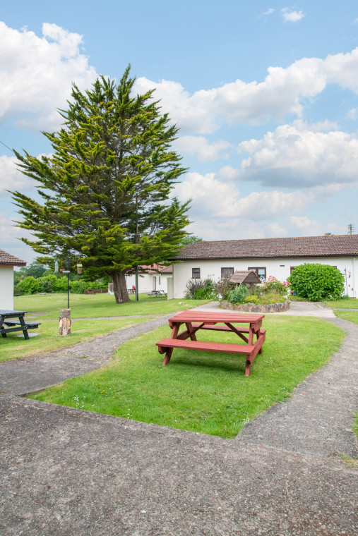 Outside: Communal gardens with view of the sea. Picnic bench outside.