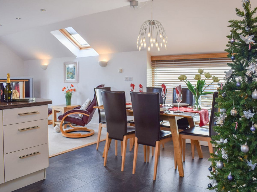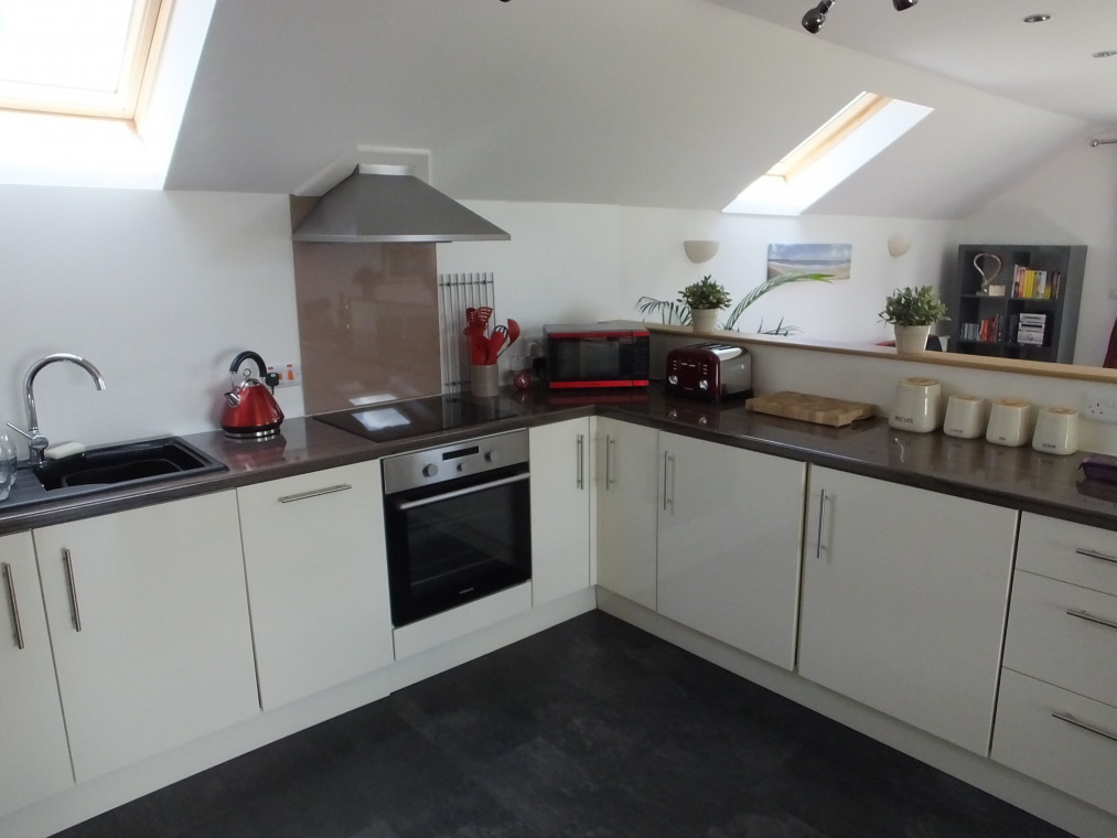 The upstairs living area is open plan. The dining table seats six and there is a spacious kitchen fitted with an electric fan assisted oven, ceramic easy clean hob, fridge and freezer, and a dish washer, as well as a good range of kitchen utensils, cutlery and crockery all provided.