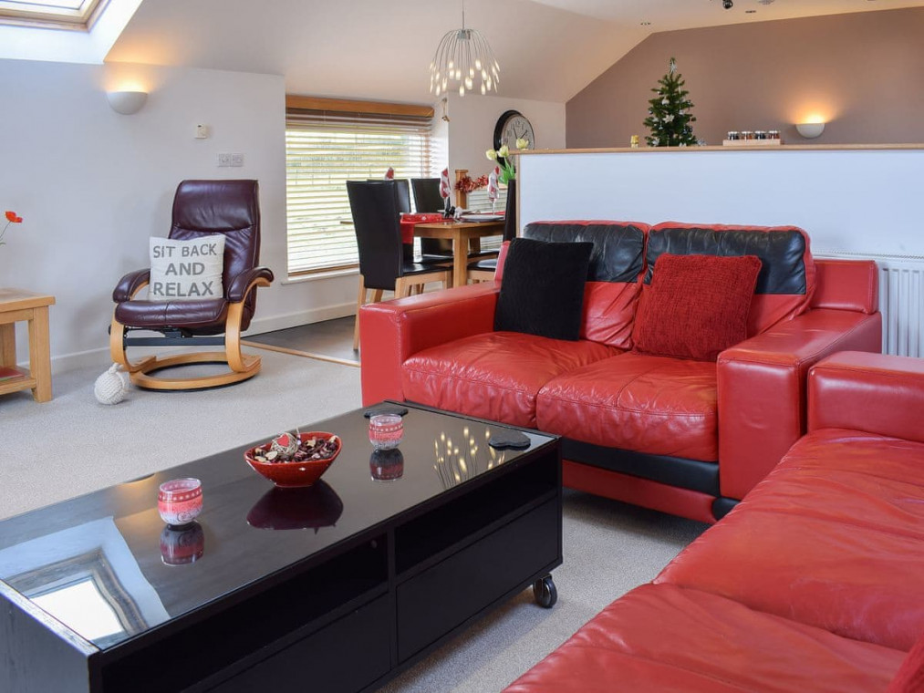 A comfy, roomy lounge area with leather sofas and relaxer chair, a 40 inch full HD TV with FreeSat and DVD player, CD player and free Wifi . Step out through the patio doors onto the balcony and sit at the table whilst enjoying the great view of the valley beyond.