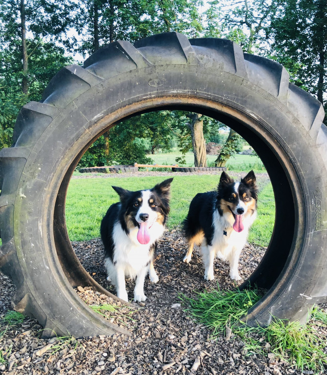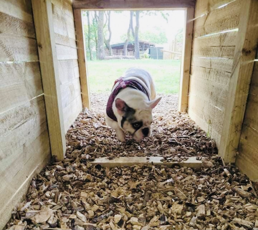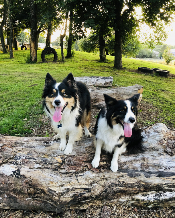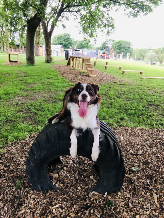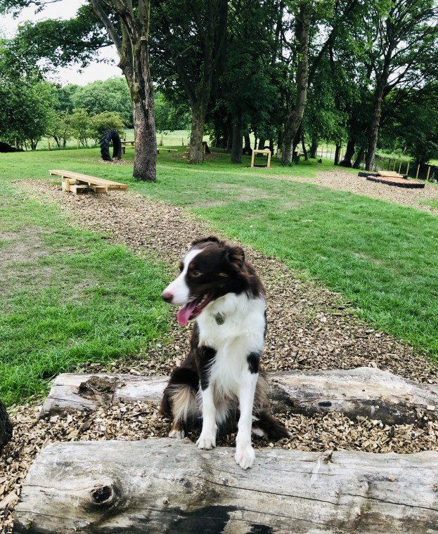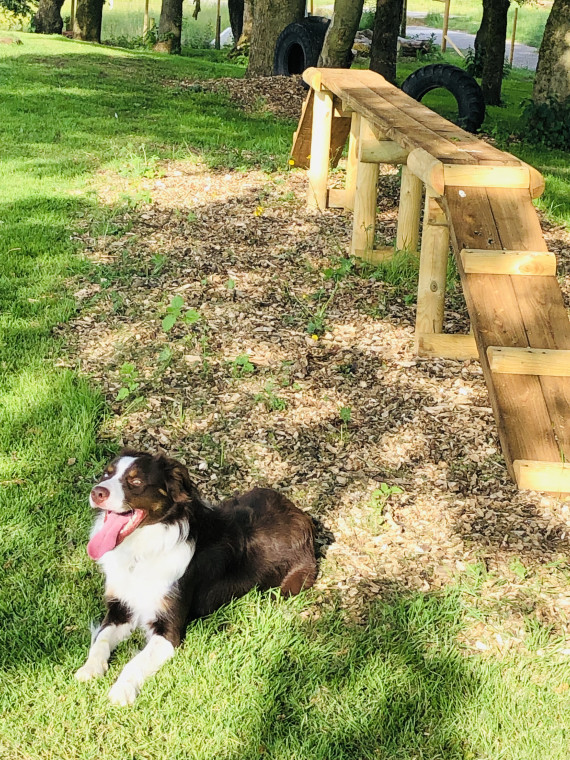 Our Dog Park is for private use & is secure with bespoke dog fencing 6 ft high & 5cm sq at the bottom of the netting, we have natural wood agility equipment & tractor tyres for your fur friends to play on, the park has mature trees to explore around & a grass paddock area.