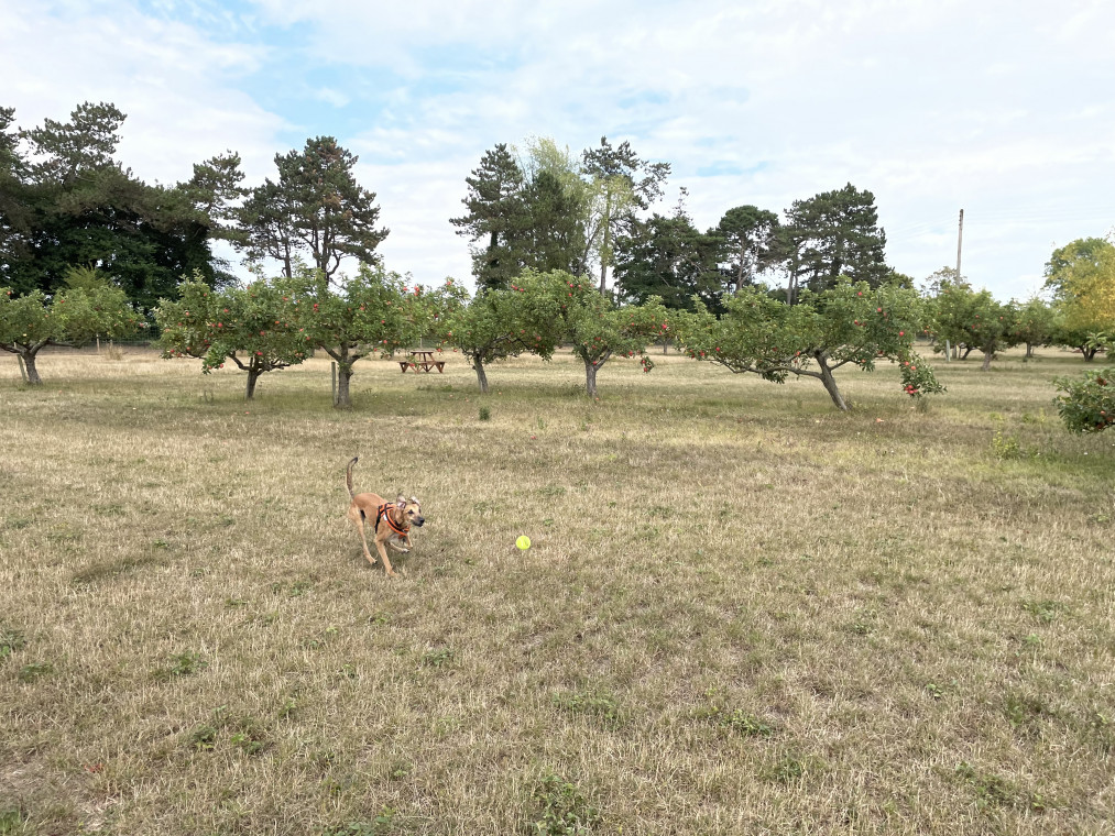 Read MoreThe Dog Orchard field is a 2.5 acre area of apple orchard and grassland with a dog secure 1.8 m high fence surrounding the field. It is the perfect place to allow your dog to exercise freely off the lead without the worry of them running off or meeting other dogs. With a mixture of apple orchard and grassland in a parkland style landscape it is a pleasure to walk through for both you and your dog. There is also a shelter with views across the field and orchards, which provides a great place to sit down, relax and watch your dogs enjoy the environment. It also provides shelter from sudden showers.