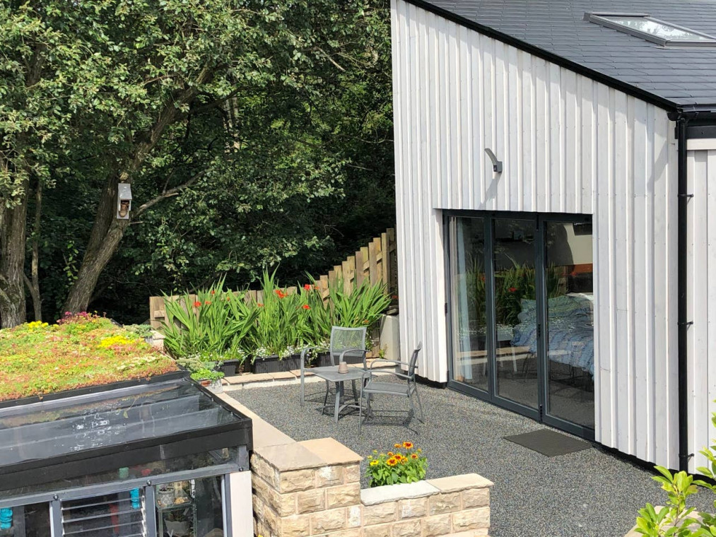 The step-free access has a bi-fold door that opens out to a patio area with seating and a table. Overlooking a garden roof, hill, and sky. Inside is one large space with an ensuite, we provide a comfortable king-size bed, a large sofa and dining area. The shower room is generous, no need to bring soap or shampoo.