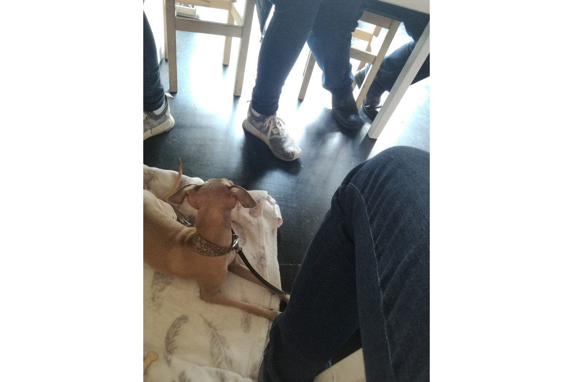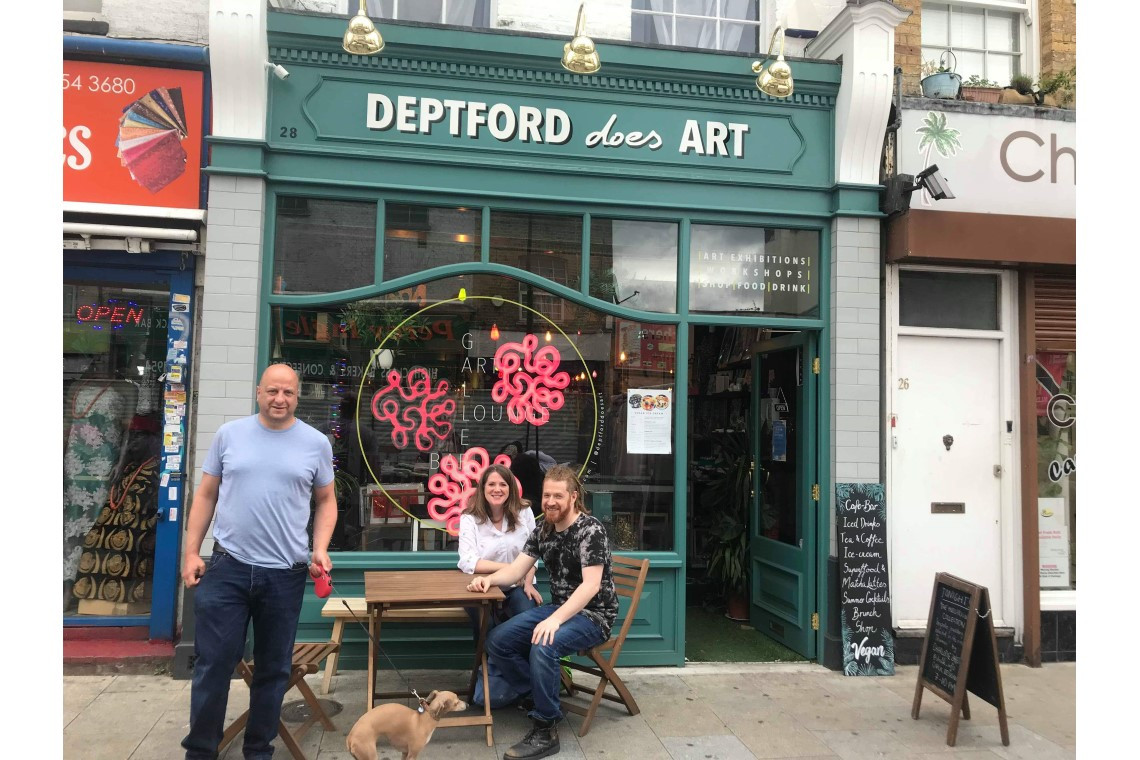 Flo our Italian Greyhound loved the chilled vibe and music. After admiring the featured works of artist Anthony McAndrew (Deptford Dogs series!) she settled happily on a blanket by our feet to enjoy her refreshments and watch the hustle and bustle of the market through the open doorway. Even though the owners were busy they gave her a welcoming drink and lots of fuss! Great space to enjoy art and a good choice of wonderful vegan food.