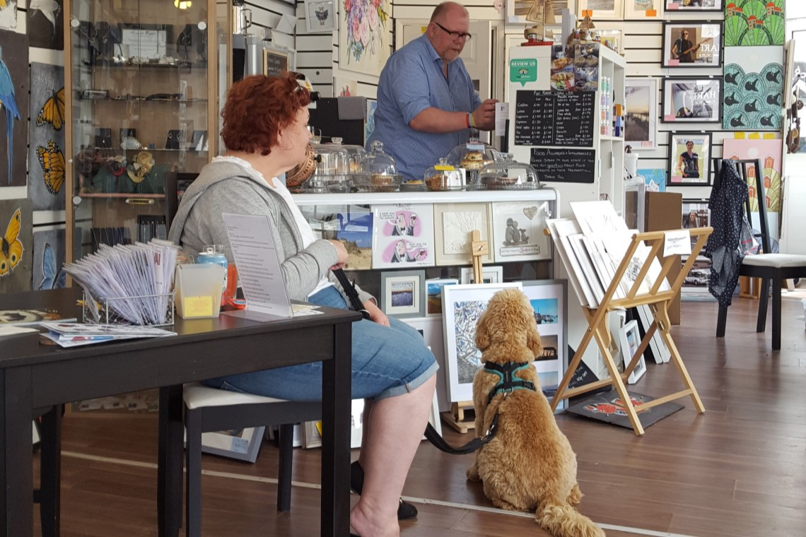 We are an art gallery that sells coffee, cakes and light snacks. Dogs are welcome, and usually treated to a biscuit.