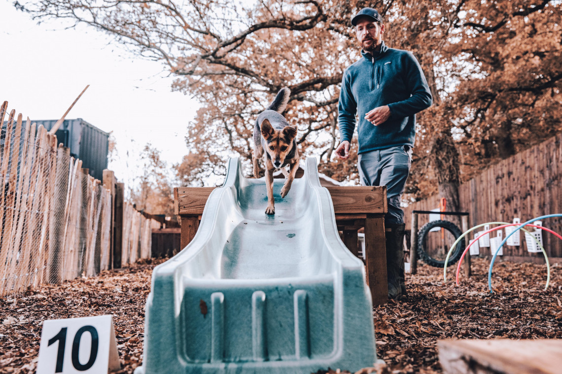Over the summer we built a brand new puppy agility area within our daycare. This is a great area where we can teach young pups one on one training.