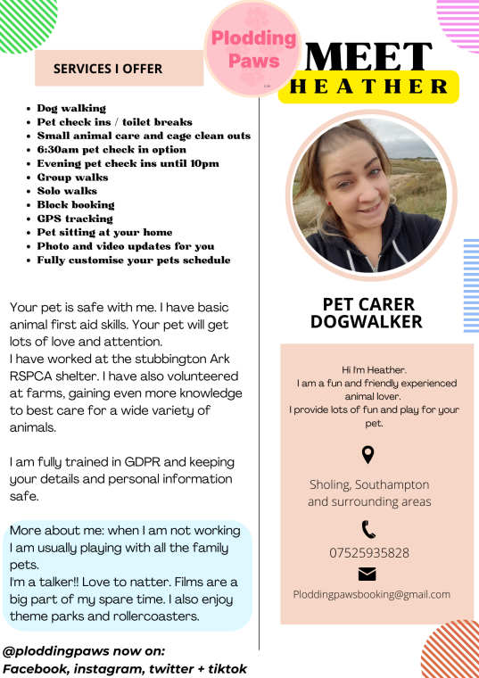 Read MoreSuperior pet care provided by skilled, professional and friendly pet carer. All services are custom to your schedule. I provide pop in sessions, pet minding in thier home and dog walking. My main aim is to deliver care to your pets to the same level as you. This ensures not only your piece of mind, also a happy pet for you to enjoy. Sometimes it is tough to give 100% to your pets. Thats where I come in. You can opt for free text, pictures or video updates. Just pick your pets schedule and we are all set. I am also fully insured with a clear DBS check. You can find some of our pack on Instagram and Facebook @ploddingpaws Speak to you soon.