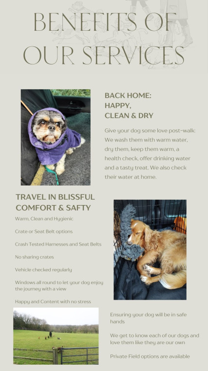 The quality care your dog deserves. Family run business since 2016, Reliable, Trustworthy, Genuinely care, Loving, Experienced, Qualified, Safe and Local. Exceptional dog care, maintaining this service to a high standard with two dog walkers on every walk.